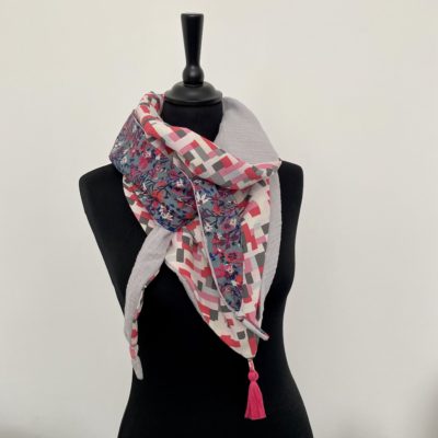 Foulard triangle viscose Liberty et double gaze / rose, gris, rouge