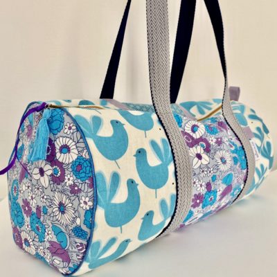 Sac forme polochon, idéal comme sac de sport ou sac multi-fonctions fourre-tout ! Succomberez-vous à son esprit rétro ? Tissu extérieur en grosse cotonnade imprimée oiseaux, coloris crème et bleu turquoise. Avec d’un côté un color-block en tissu imprimé japonisant turquoise, et de l’autre côté un tissu vintage fleuri violet et bleu, comme sur les 2 ronds de côté. Entièrement doublé de coton gris clair. Sangles bicolores gris/marine de 62cm pour un porté épaule. Large zip vintage avec grosse boucle métallique comme tirette, agrémentée d’un petit pompon assorti, d’un ruban satiné, et d’une breloque « oiseau ». Passepoil bleu métallisé sur les 2 côtés pour une jolie finition. Voilà un sac unique, original et pratique!
