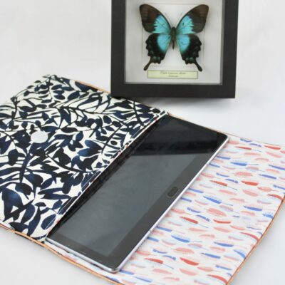 Cette housse pour ipad et autres tablettes tactiles est réalisée en enduit inversé (tissu lin extérieur, mais enduit par dessous) à motif « feuillage » marine et blanc, doublée de tissu imprimé plumes, et molletonnée pour limiter les chocs.