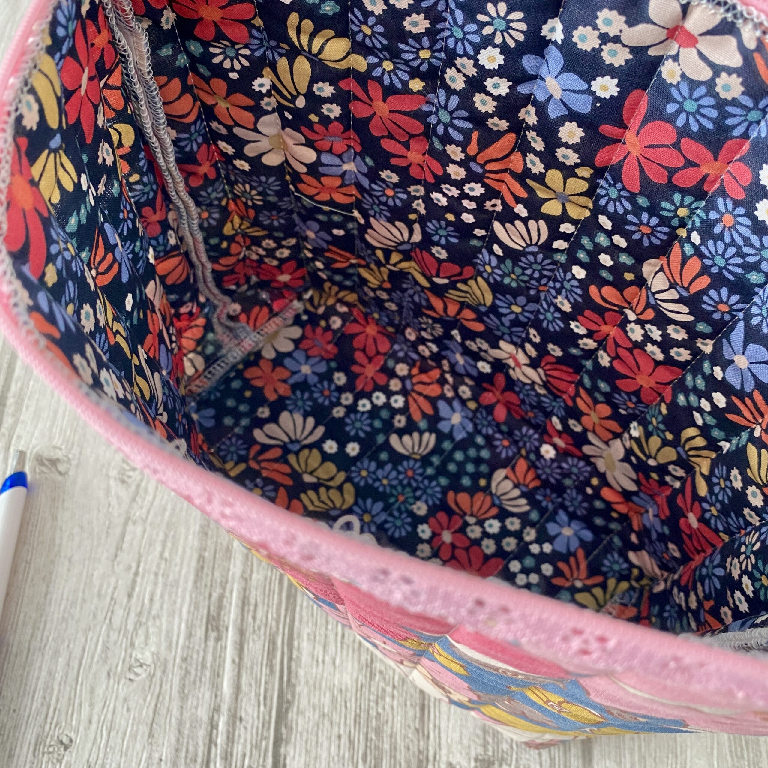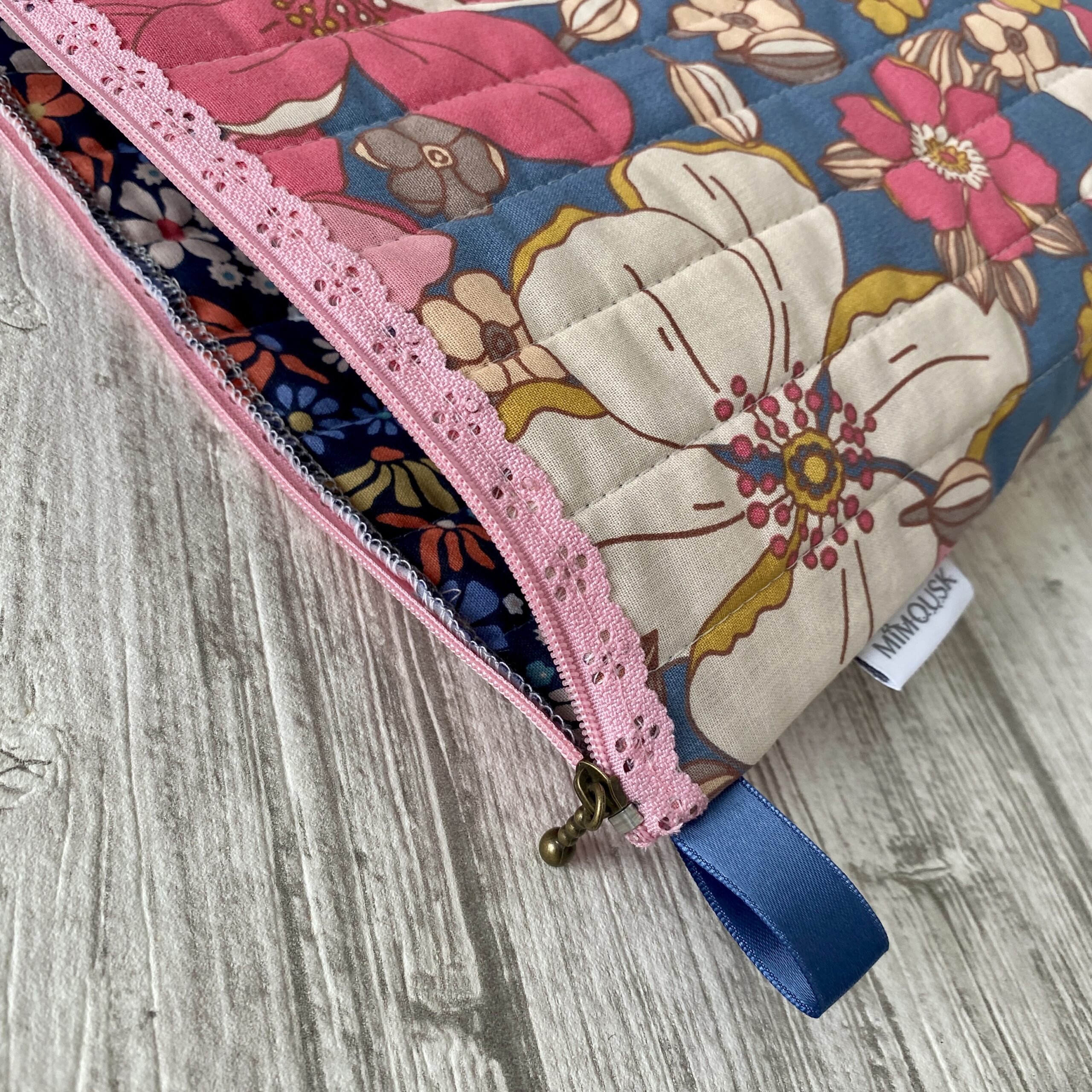 Trousse en tissu fleuri matelassé imprimé. Grand format atypique pour par exemple protéger un ou deux livres, mettre ses affaires de toilette, ou tout autre petit bazar!  Coloris rose, jaune, bleu, avec des grosses fleurs stylisées. Zip dentelle rose, pour une grande ouverture de 27cm. Modèle unique!