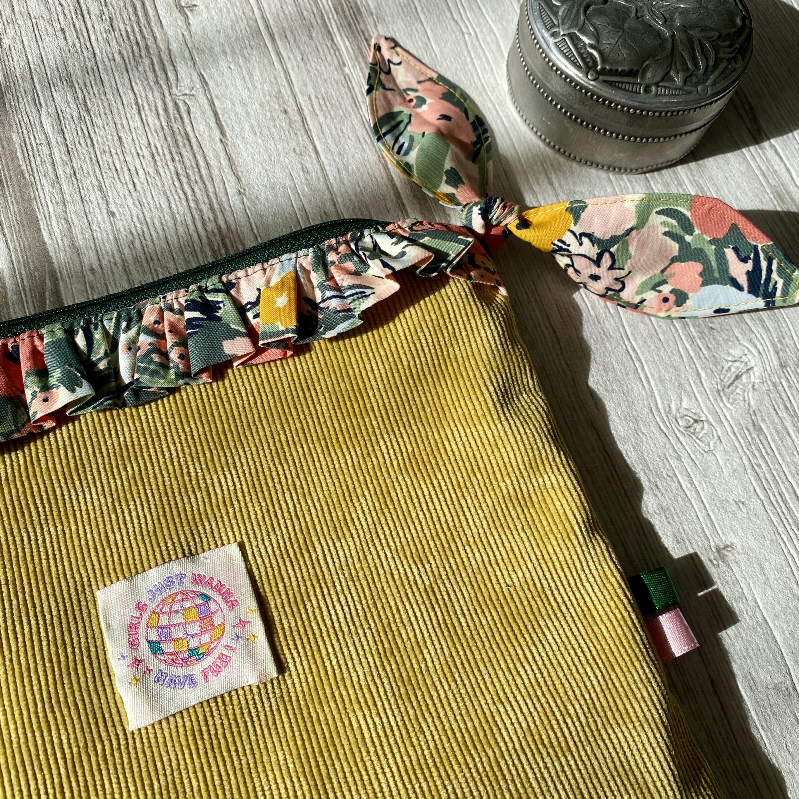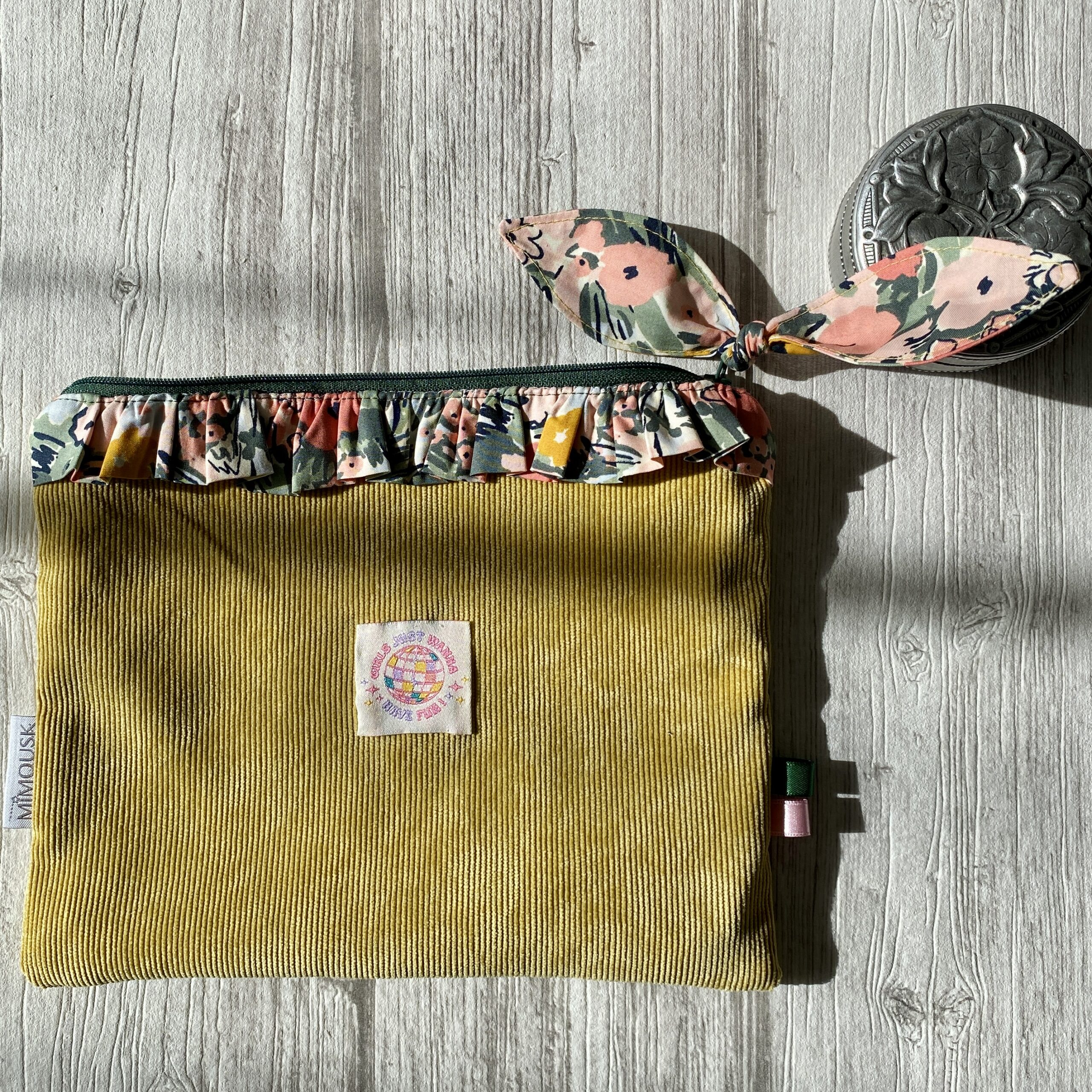 Pochette plate originale doublée. Extérieur en velours fines rayures moutarde, et doublure en coton imprimé fleuri (Floral fest, de Nerida Hansen). Noeud assorti sur le zip, et frou-frou décoratif. Etiquette décorative « Girls just wanna have fun ». Une trousse polyvalente chic et unique.