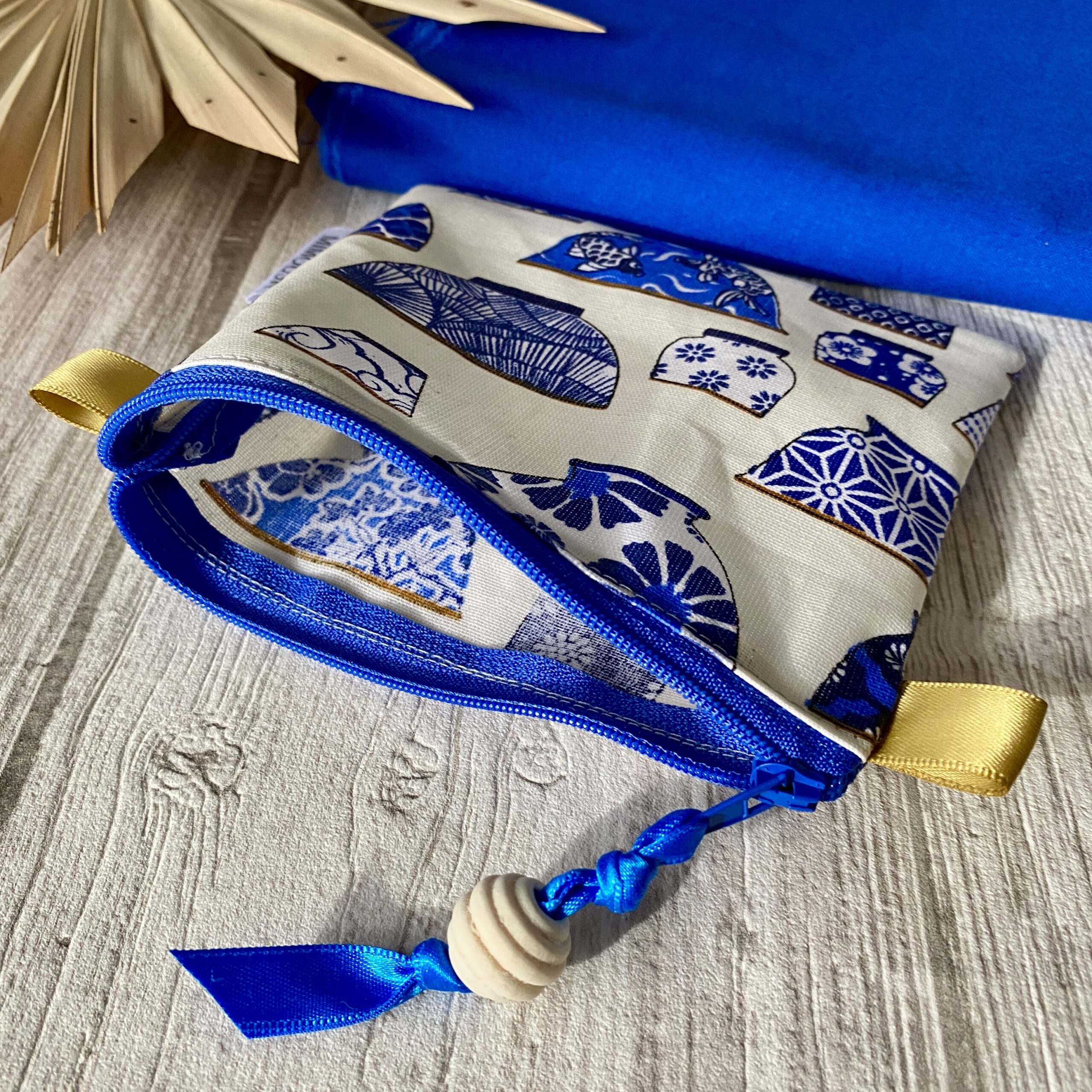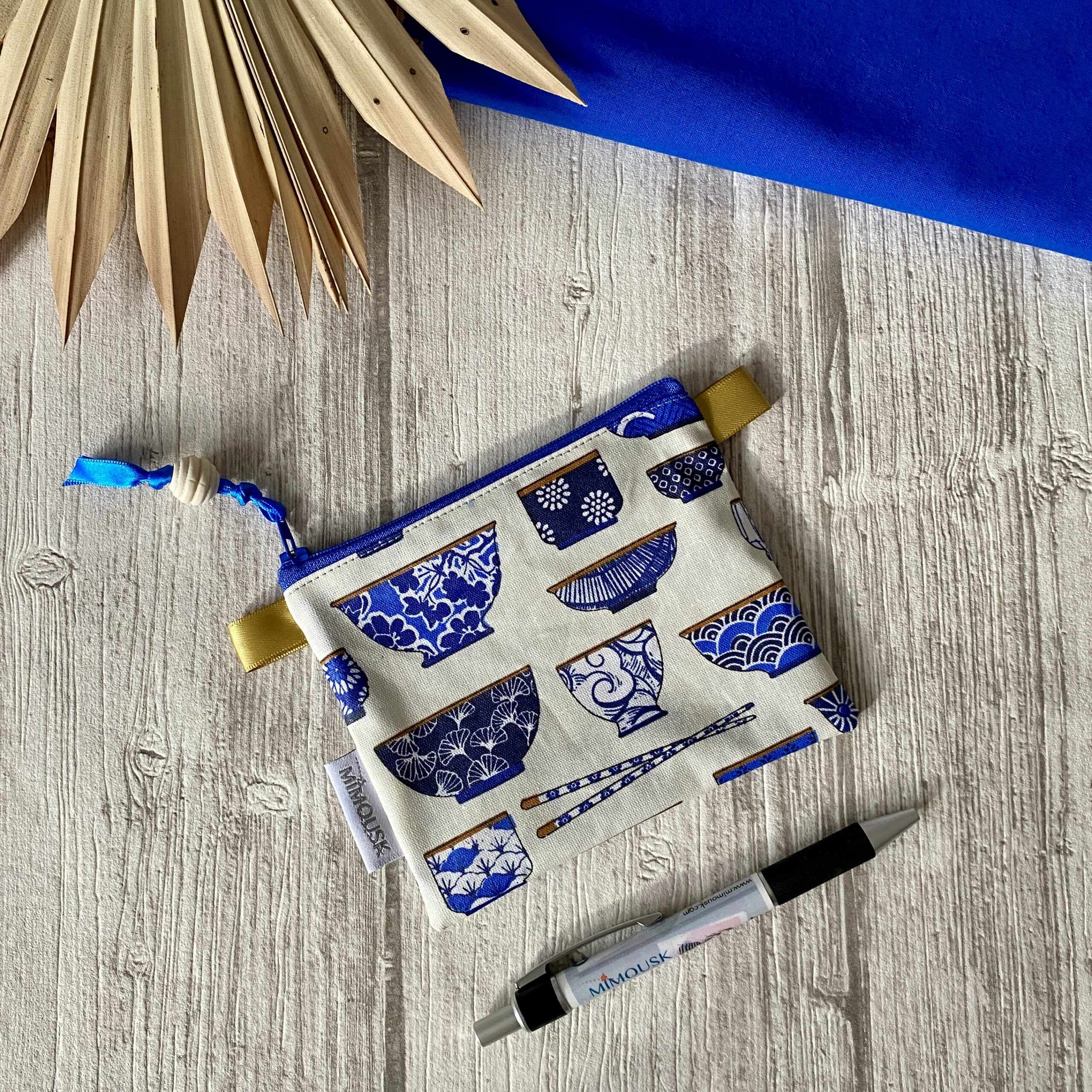 Porte-monnaie ou « trousse-discrétion » petit format (à glisser dans le sac avec ses affaires de filles ;)), en tissu enduit plastifié souple. Non doublée pour plus de légèreté. Zip d’ouverture 13cm. Perle de bois et ruban décoratif sur la tirette.