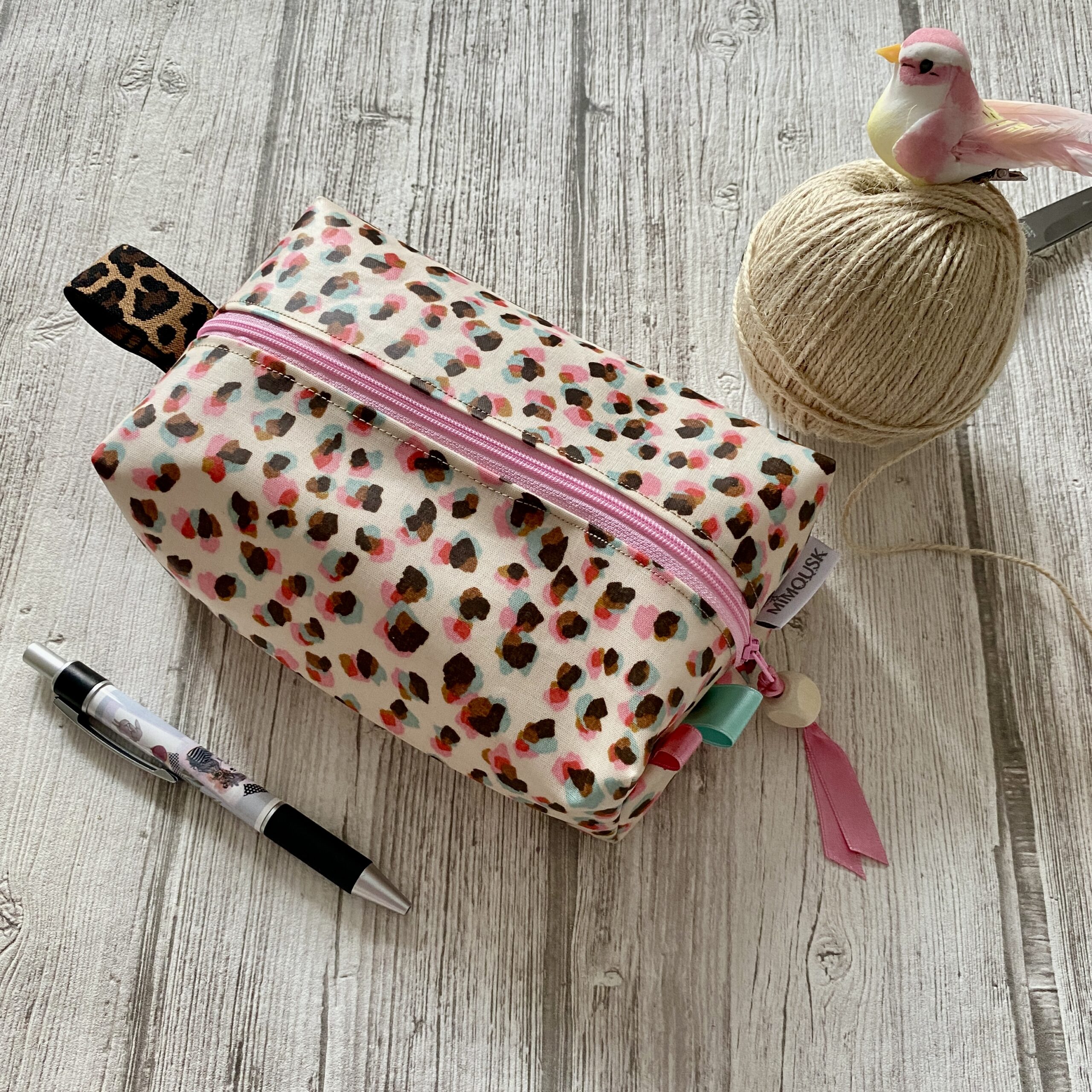 Trousse de toilette de belle contenance pour vos produits de beauté. Cousue n tissu enduit non doublé. Elle bénéficie d’une large ouverture pour avoir accès facilement à ses accessoires de beauté. Tissu coton enduit mat sans phtalates, lavable d’un coup d’éponge humide! Un ruban pour la déco, et une perle de bois sur la tirette agrémentent la finition. Elastique motif léopard sur le côté.