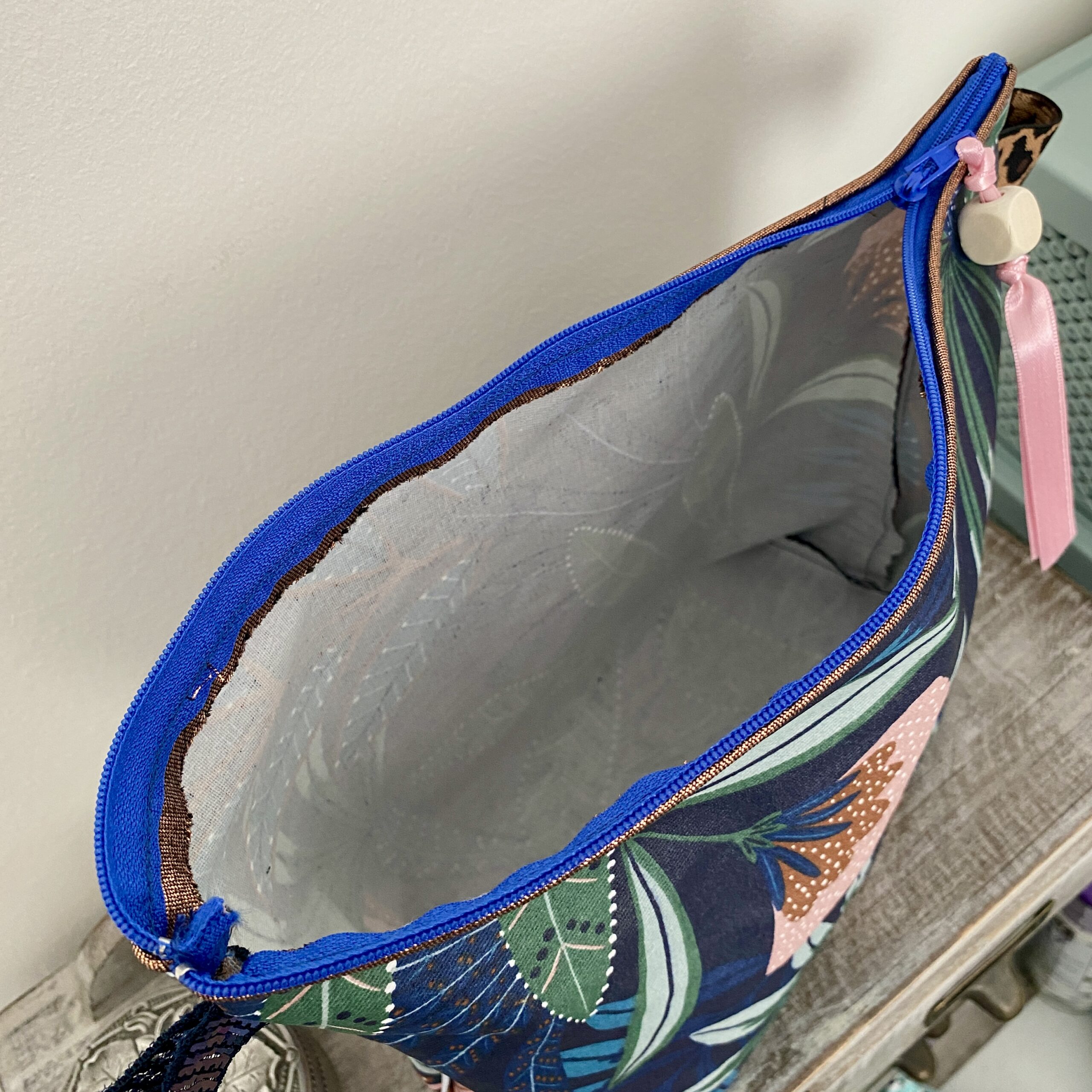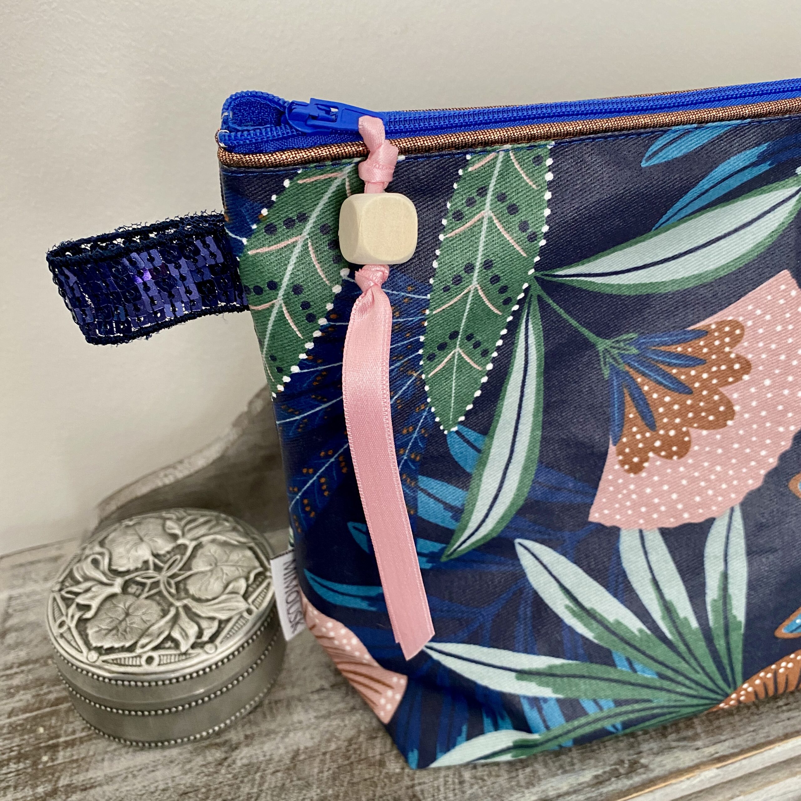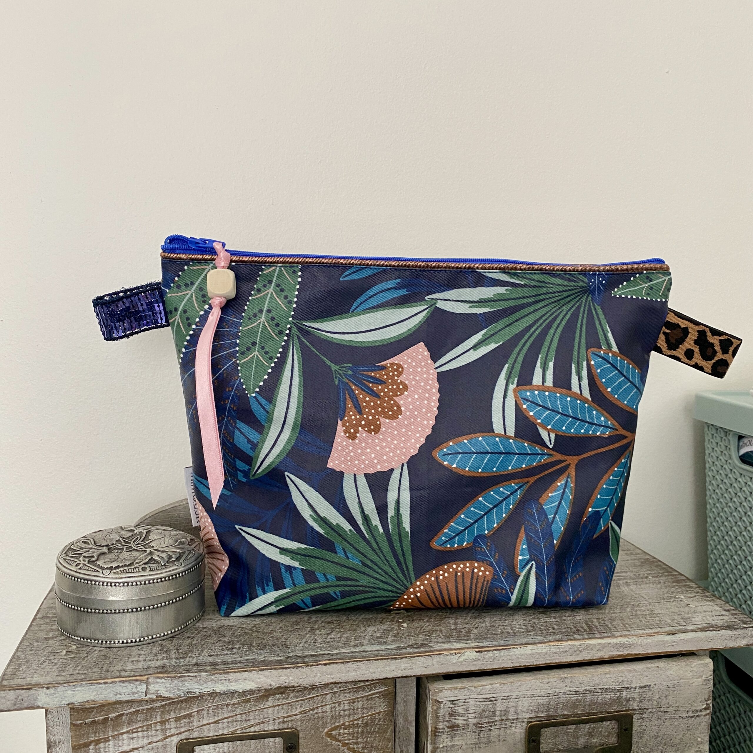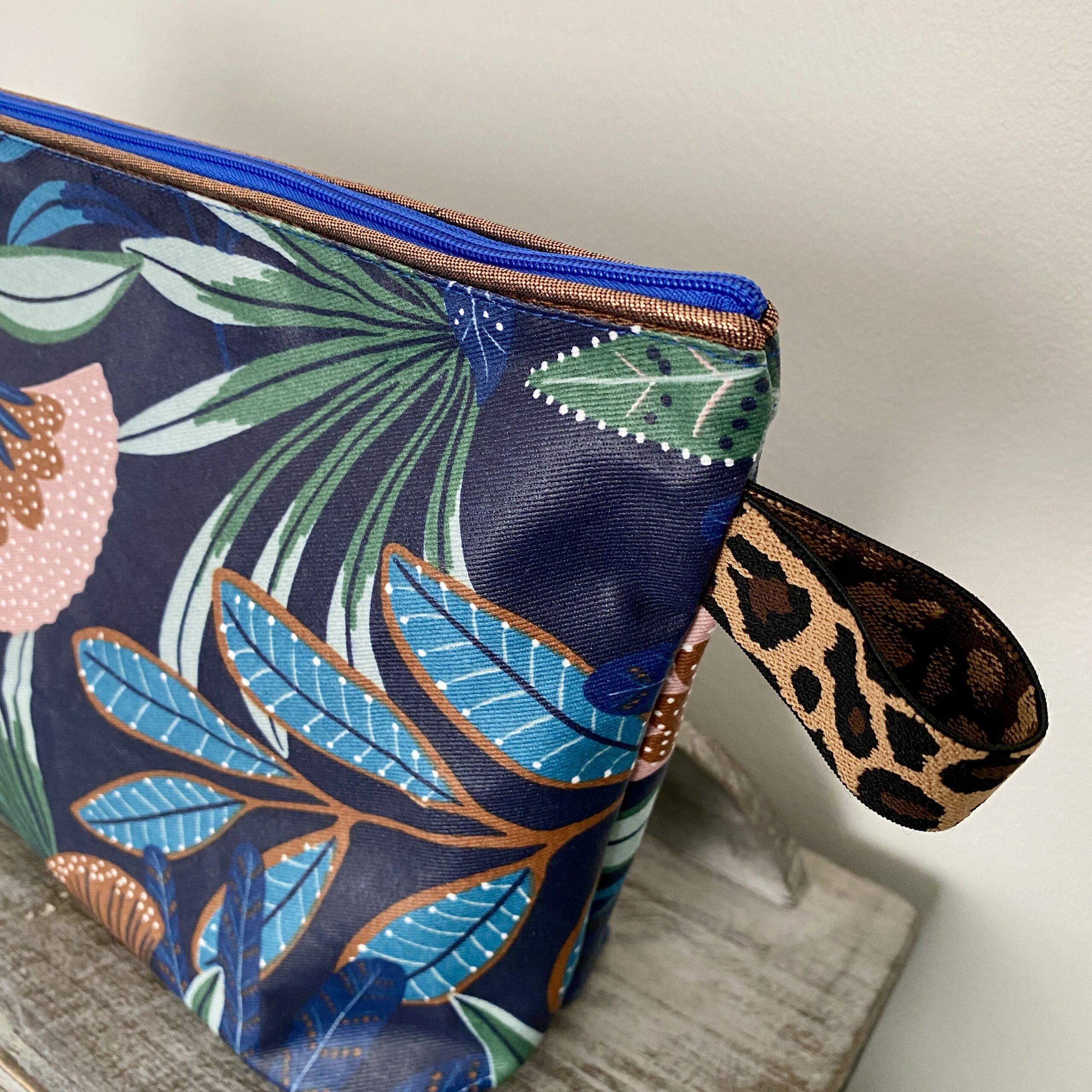 Motif Tropical, coloris bleu indigo, rose, vert et cuivre. Trousse de toilette très pratique et très chic!