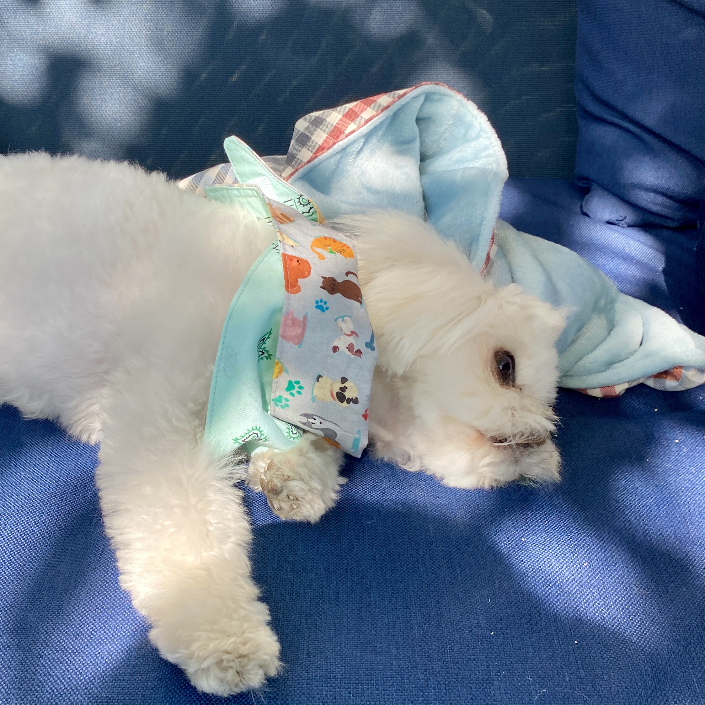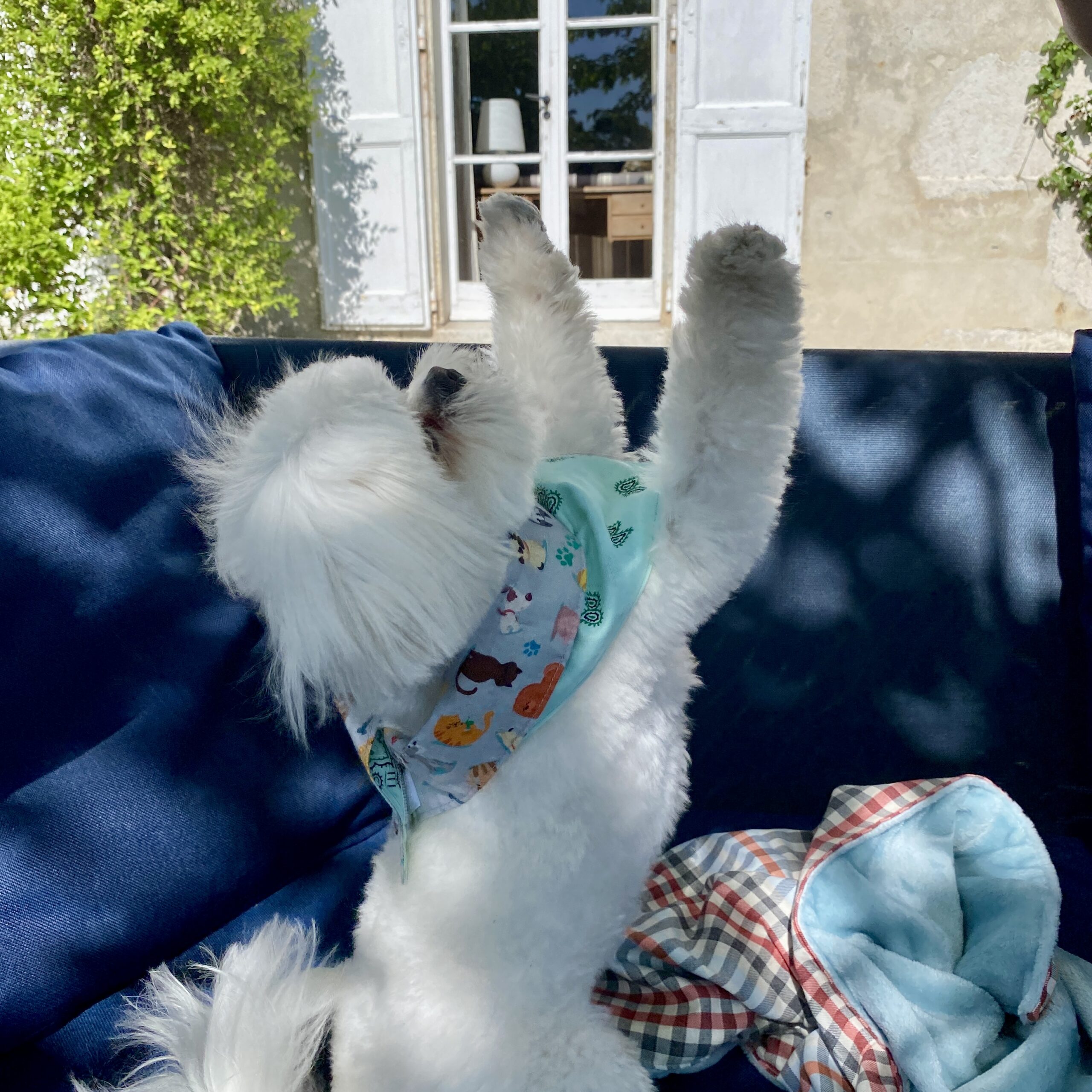 Bandana pour petit toutou stylé ! Réversible : 2 faces en coton imprimé. Velcro pour l’attacher. Qui sera le/la plus chic au parc ??