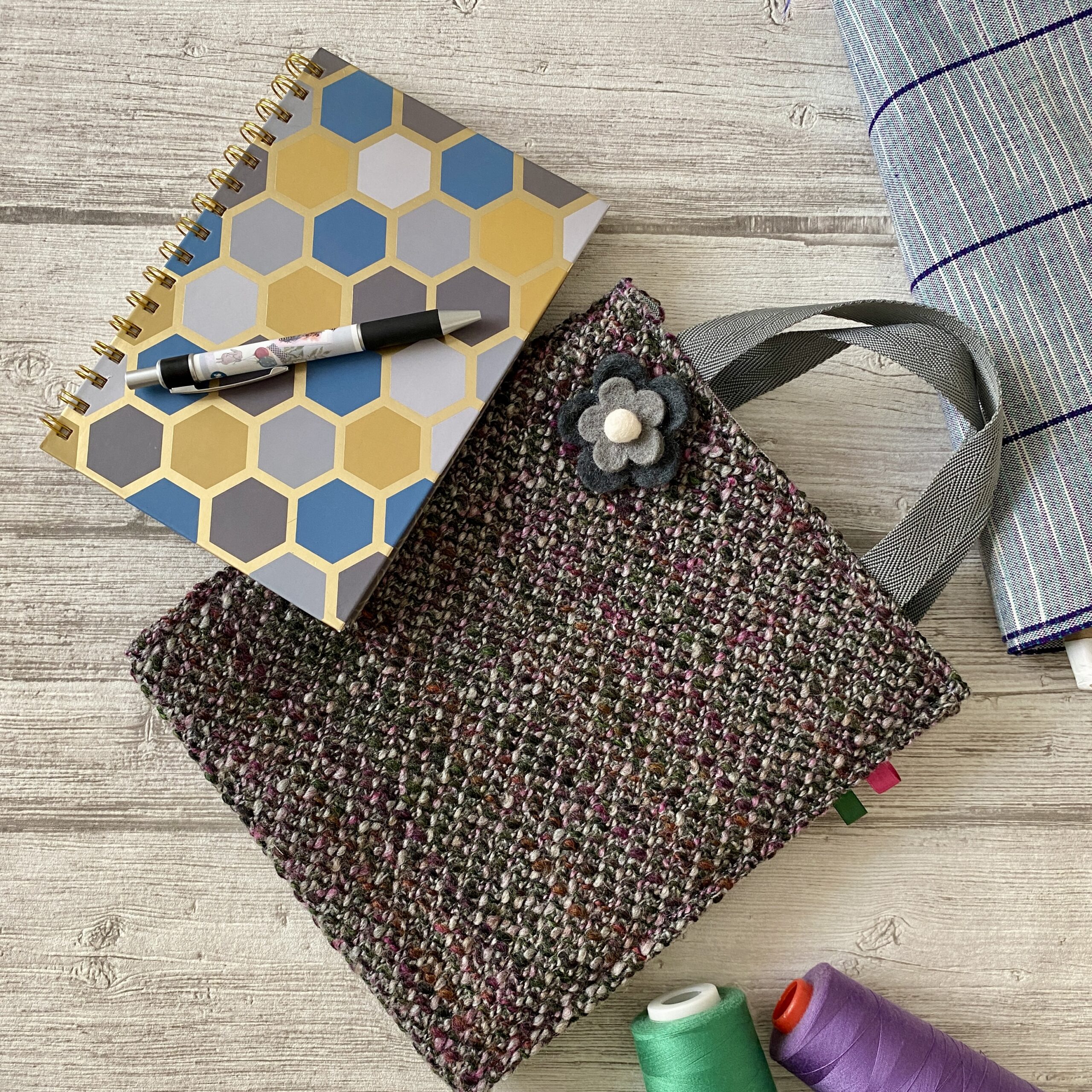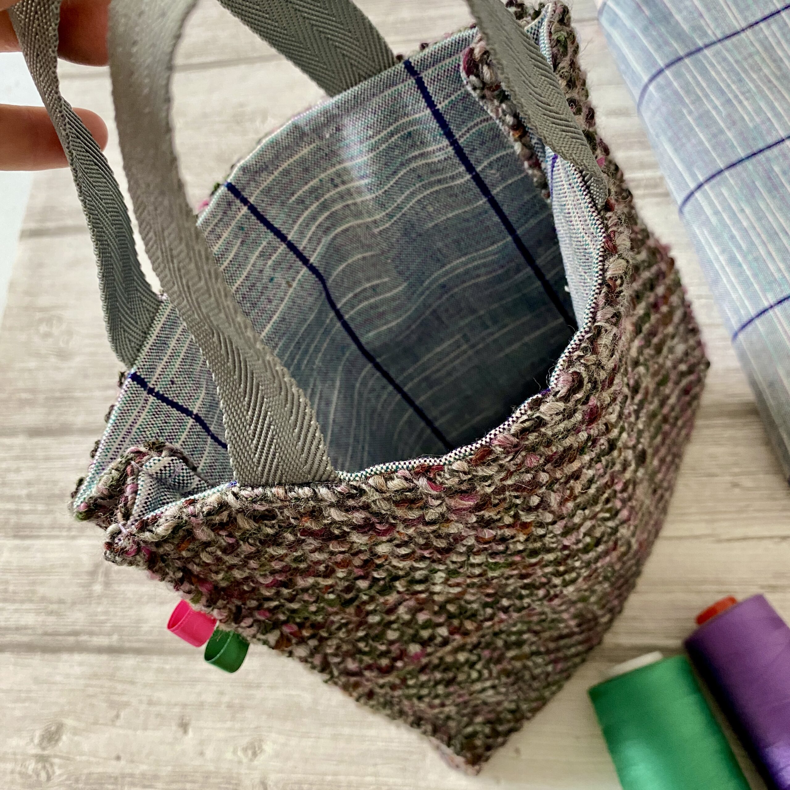 Mini sac cabas en tricot, double tissu rayé, dans les tons de violet, rose, gris, vert. Petites anses en sangle grise. Doublure en coton épais rayé gris, vert, violet. Broche fleur en feutrine grise pour une jolie finition. Petite contenance pour protéger un livre par exemple. Modèle unique, fait-main en France.