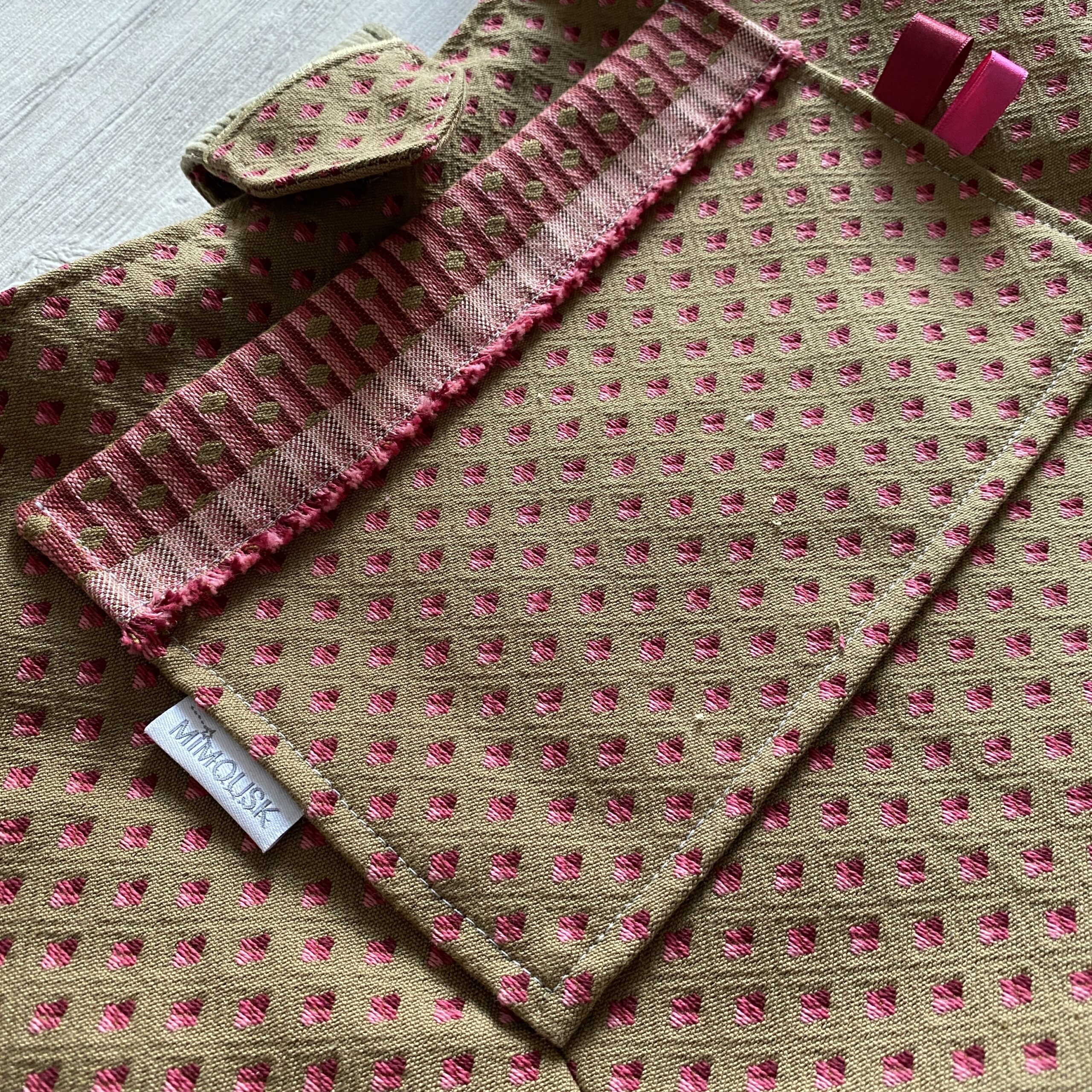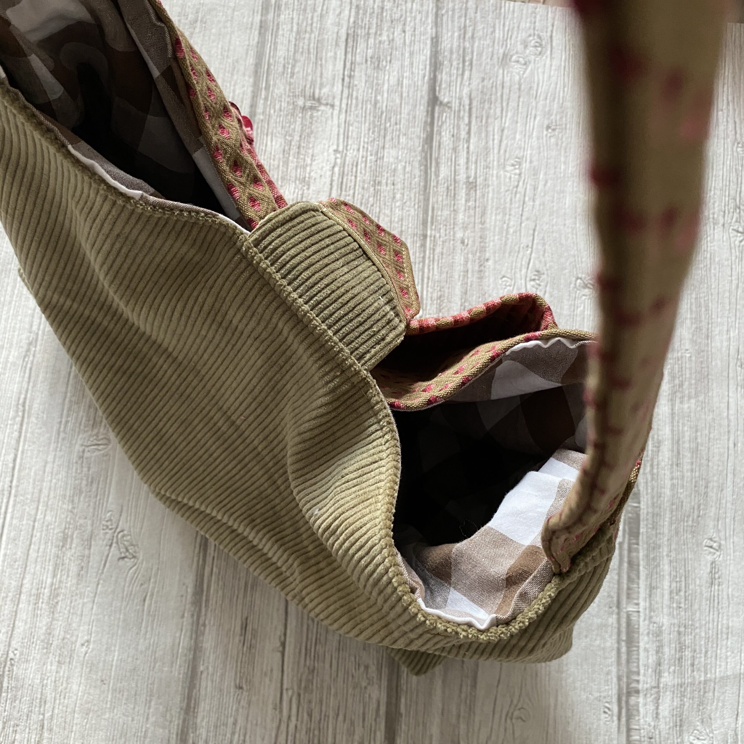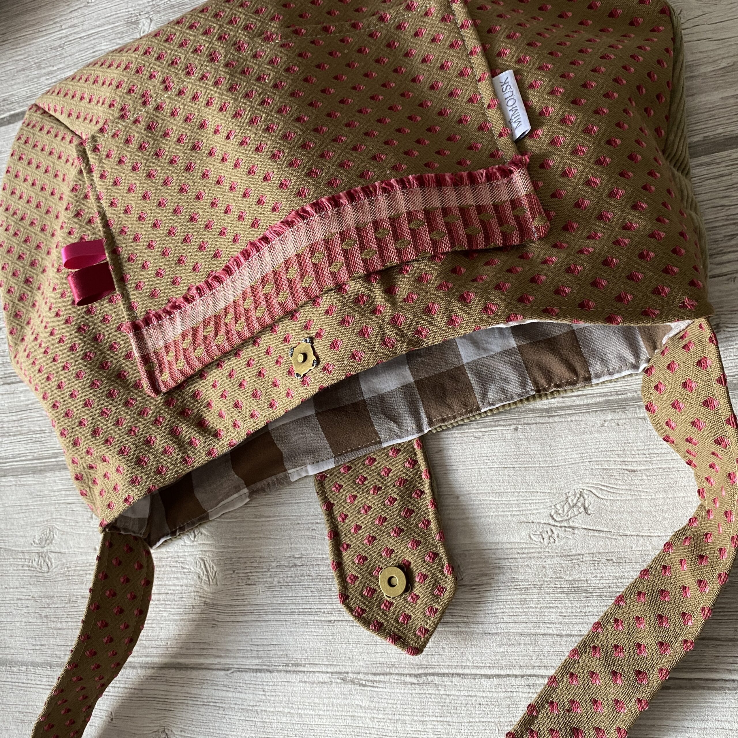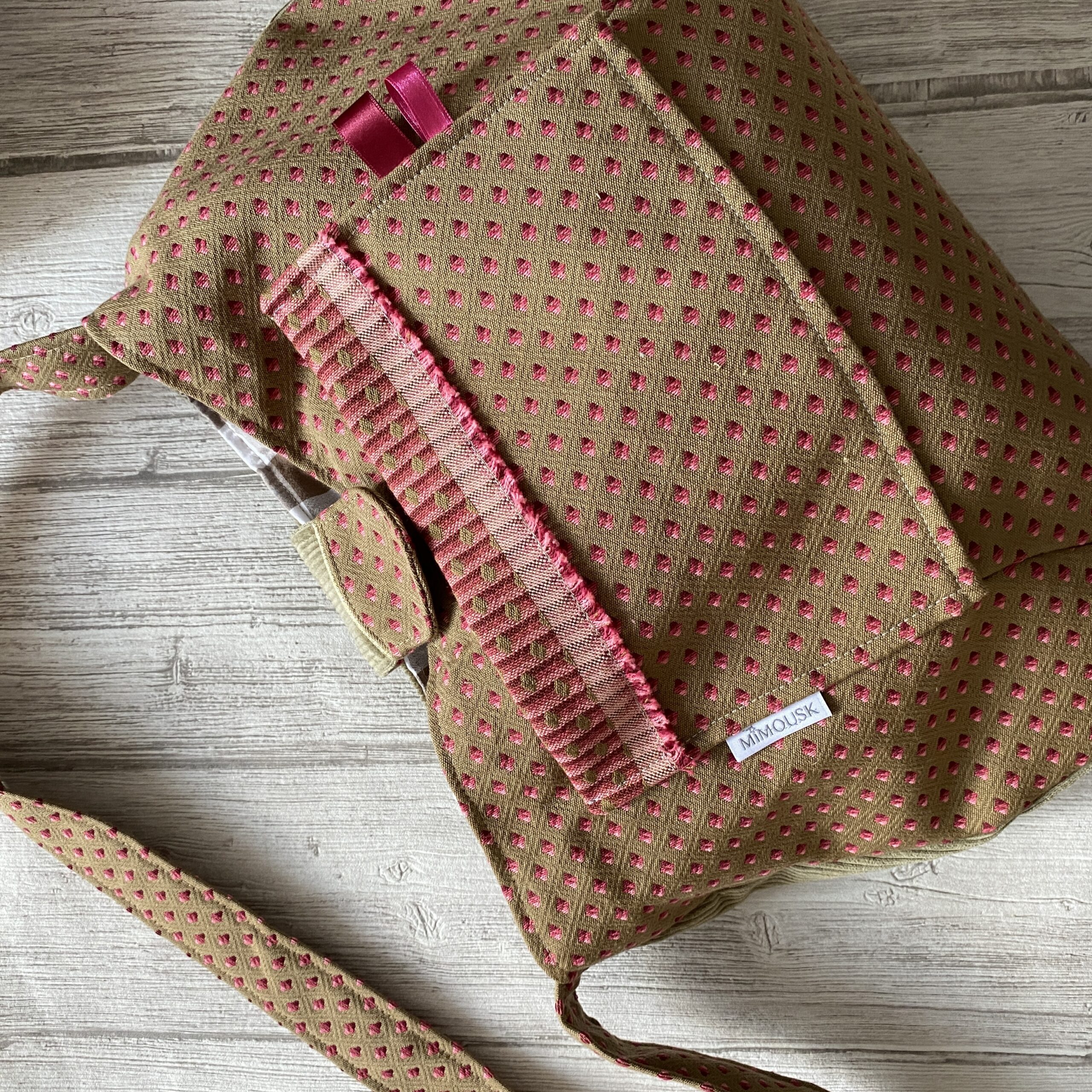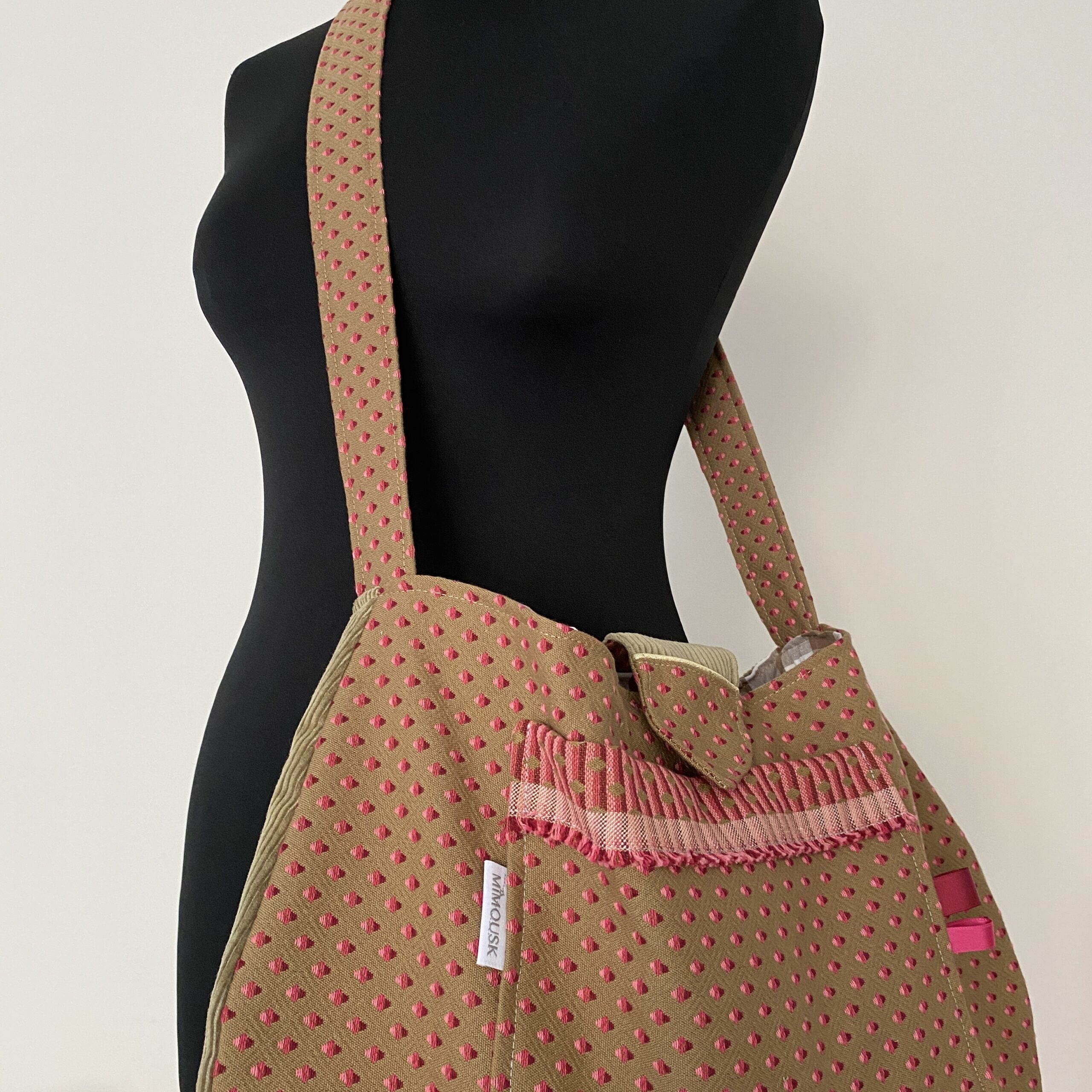 Sac bandoulière forme boule, grand format . En tissu texturé jacquard beige, bordeaux, rose, et velours beige. La sangle bandoulière vous permettront de le porter croisé. Forme arrondie sur le bas. Poche plaquée devant. Doublure coton à carreaux beige/blanc. Attache par patte avec pression. Modèle unique pour ce sac bandoulière chic, parfait pour l’automne/hiver.