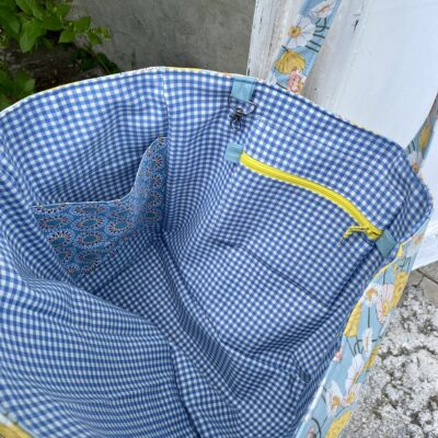 Grand cabas enduit en simili résistant. Joli motif un brin rétro avec ses fleurs, coloris ciel et jaune. Parfait pour la plage ou le marché ! Doublé en vichy ciel. Poche zippée intérieur et porte-clé. Anses en simili assorties. Grand sac unique et stylé !