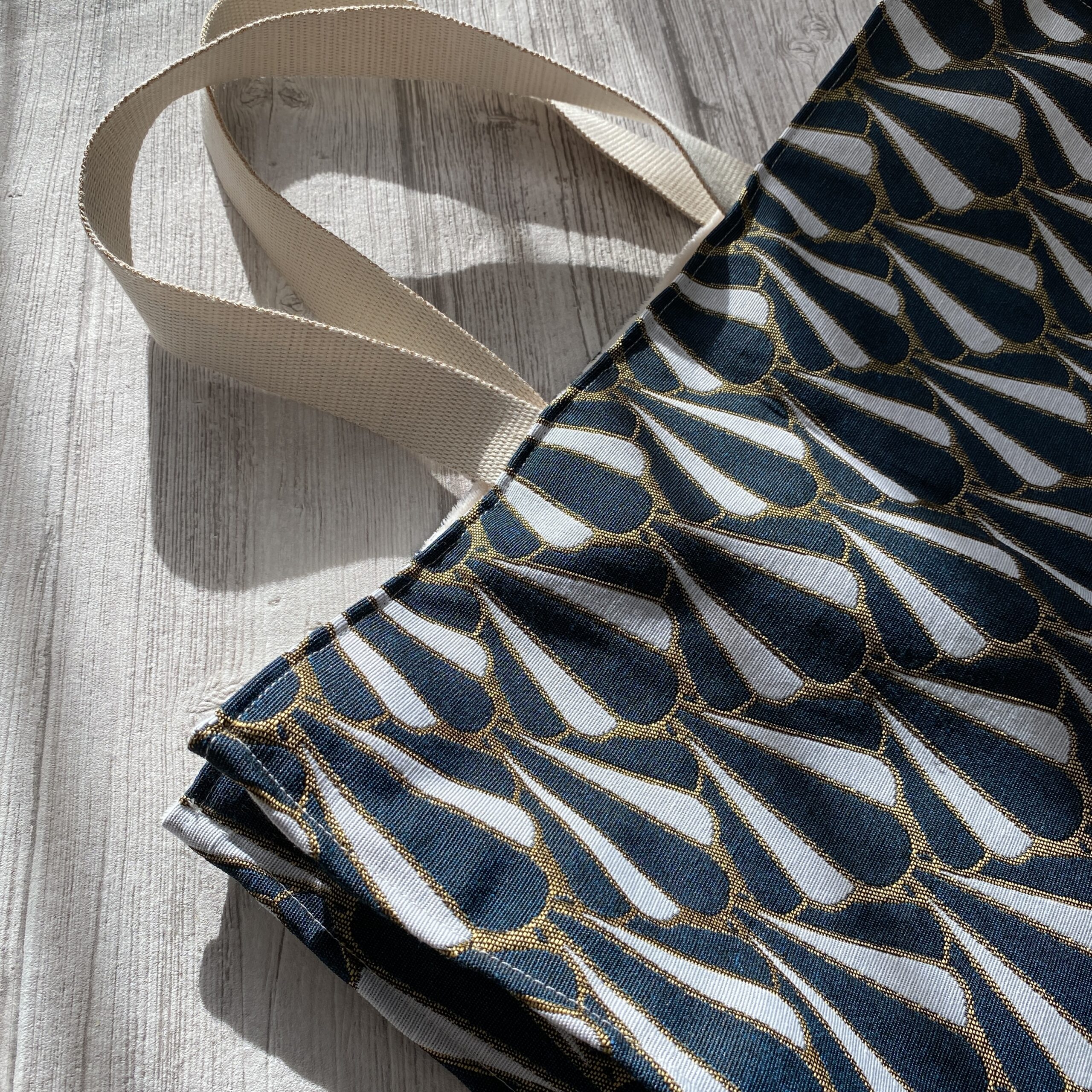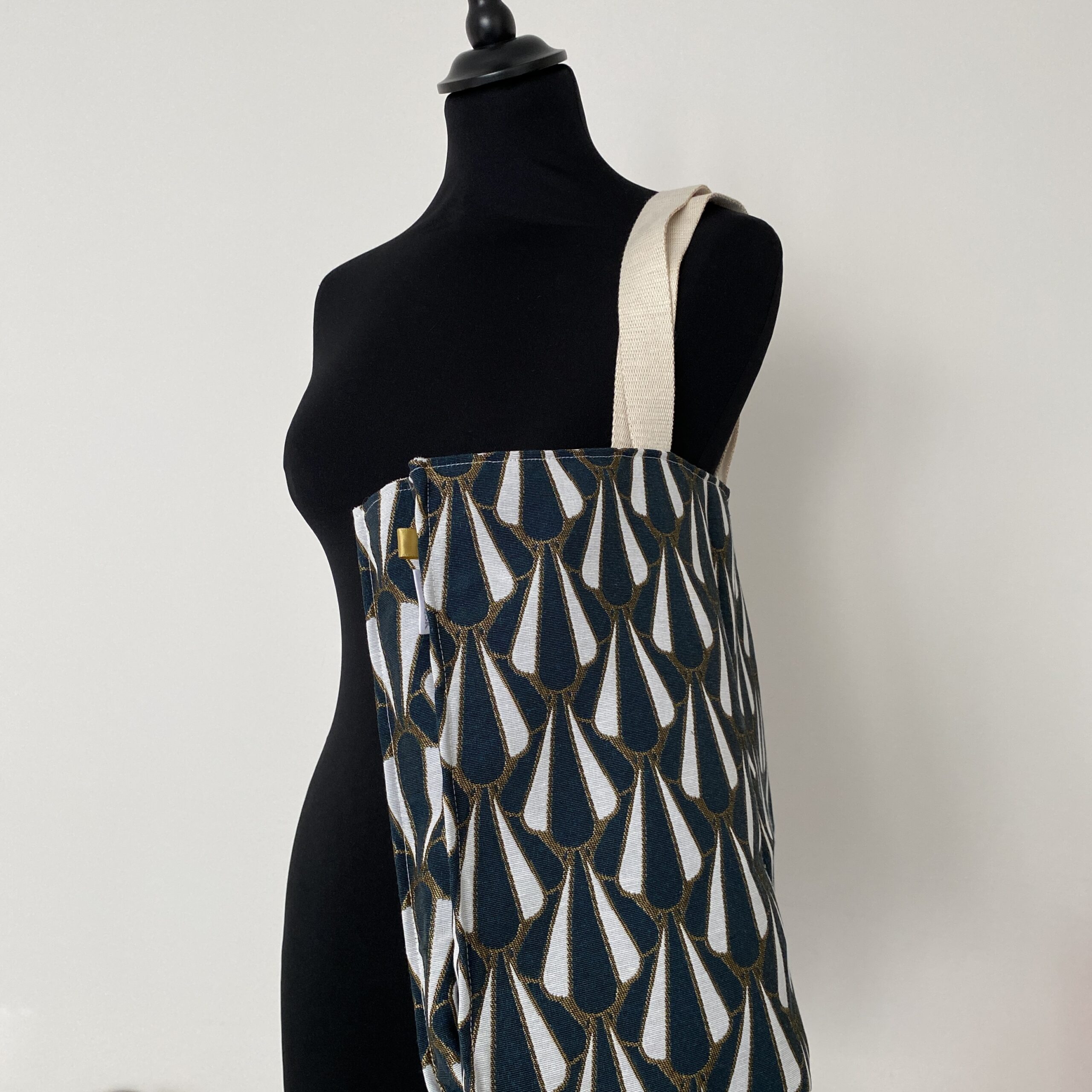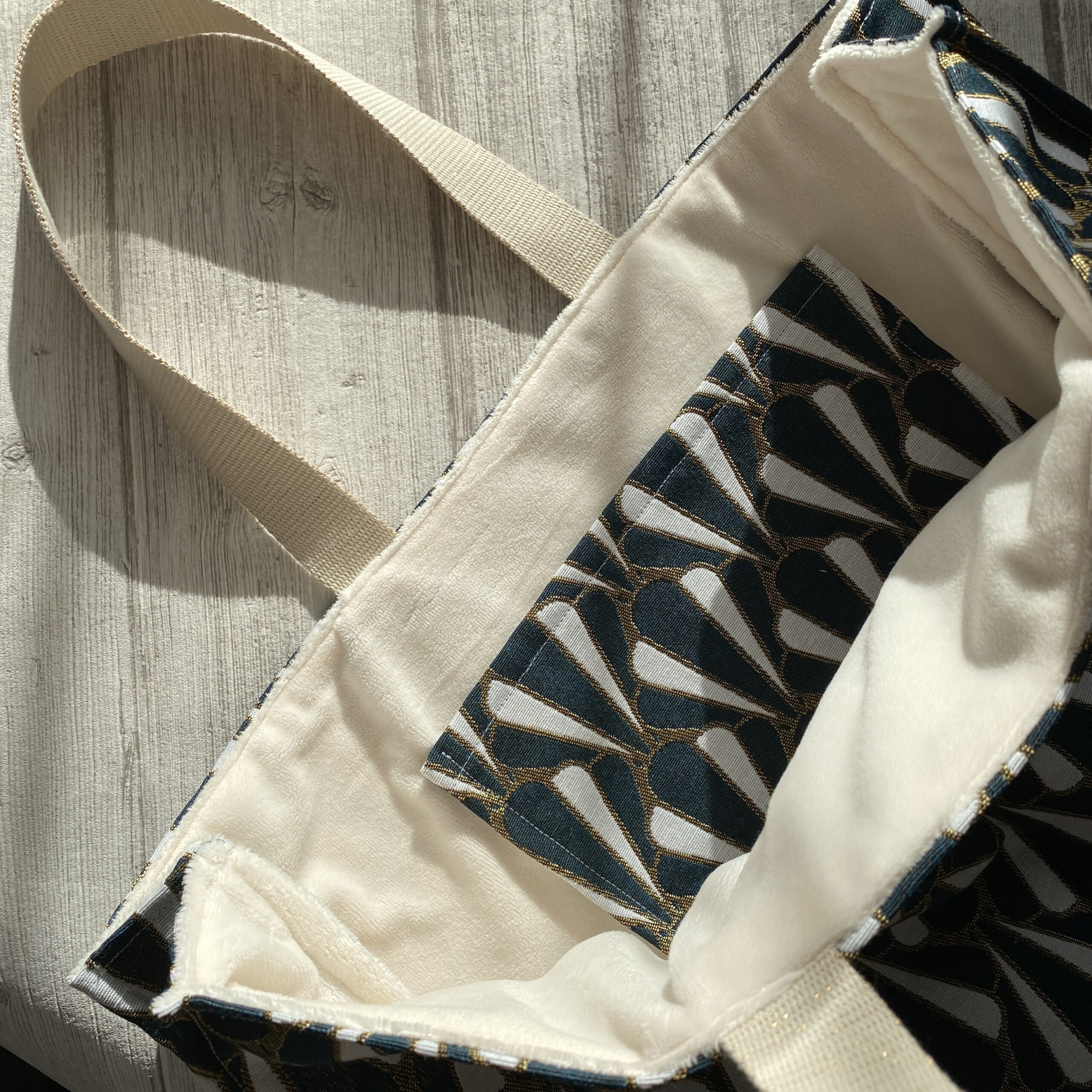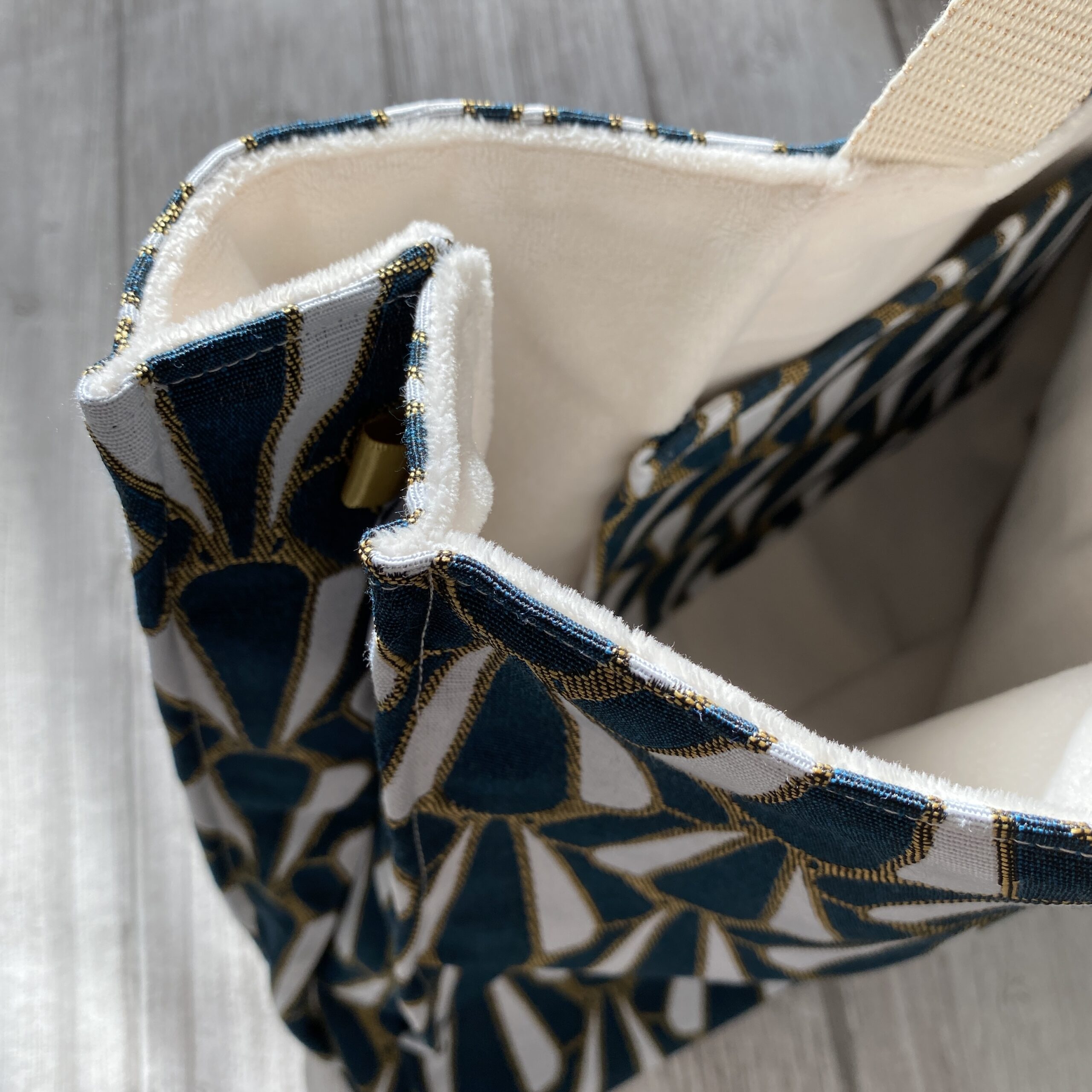 Sac cabas format XL en tissu jacquard doublé de micro-polaire toute douce. Motif style art déco, coloris bleu canard, or et écru. Anses en sangle écru pailletée. Poche plaquée assortie à l’intérieur. Un sac stylé pour faire ses courses ou transporter beaucoup d’affaires ! Modèle unique pour ce sac très grand format chic et parfait pour l’automne/hiver.