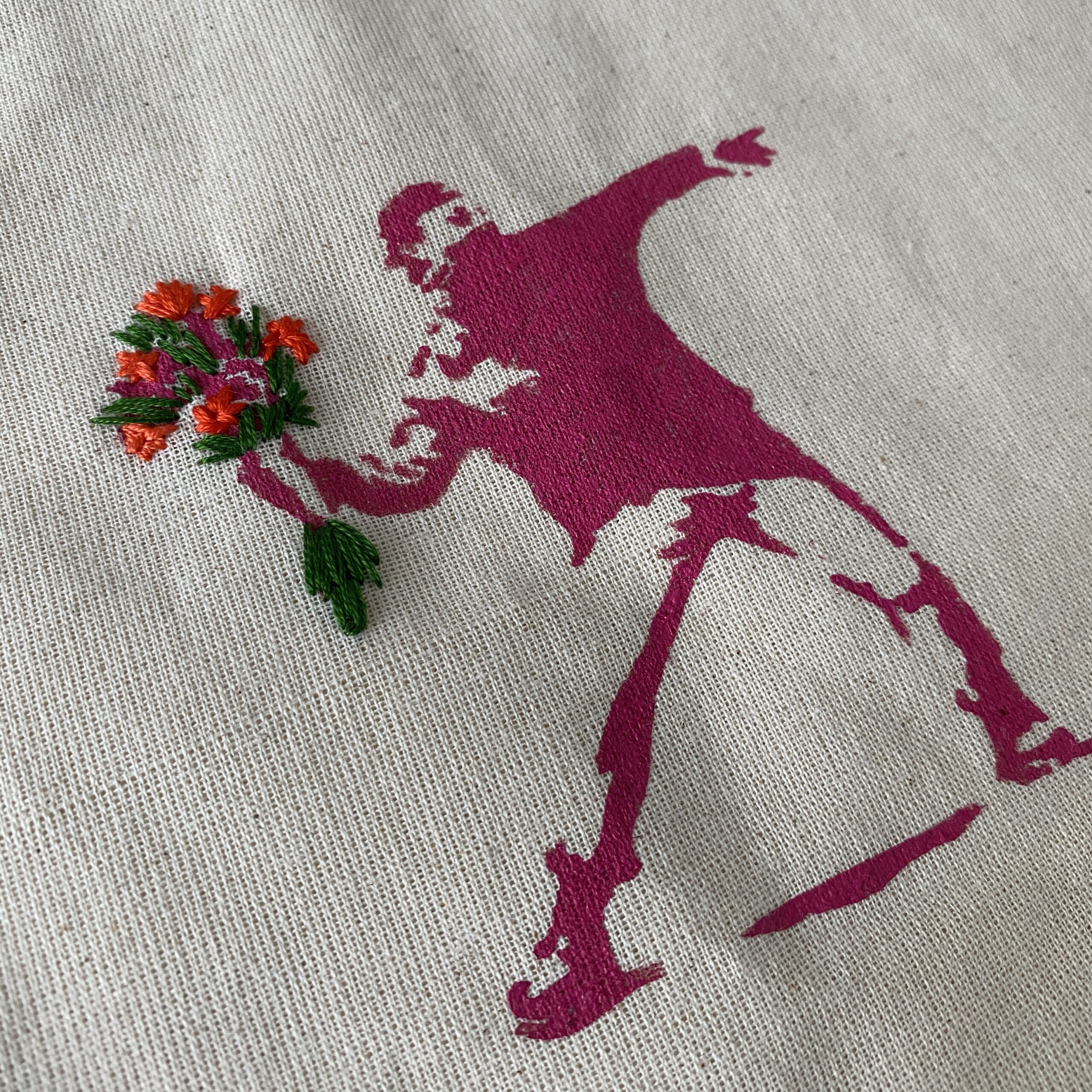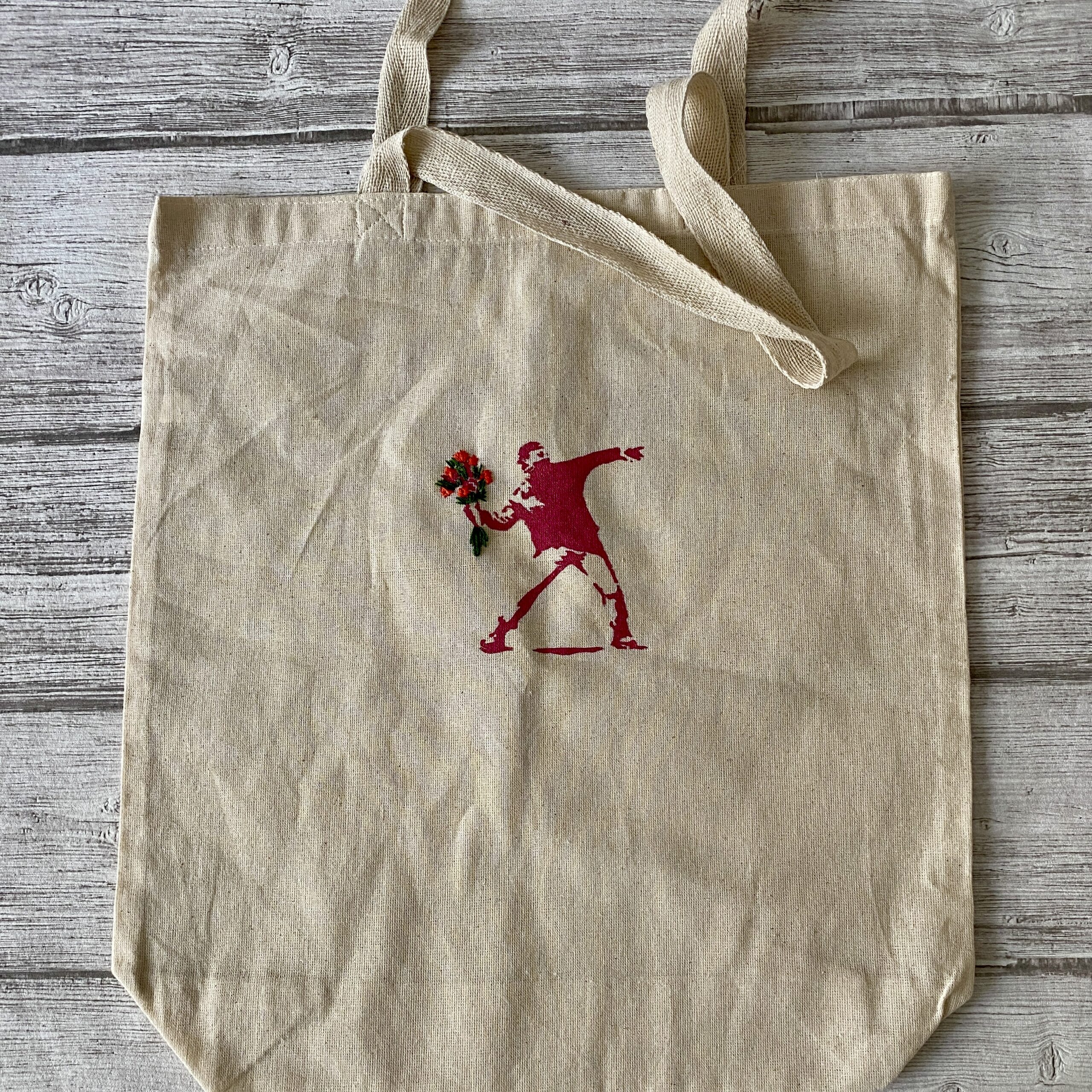 Sac totebag. Pochoir Banksy à l’encre textile, rebrodé main. Tissu coton recyclé.