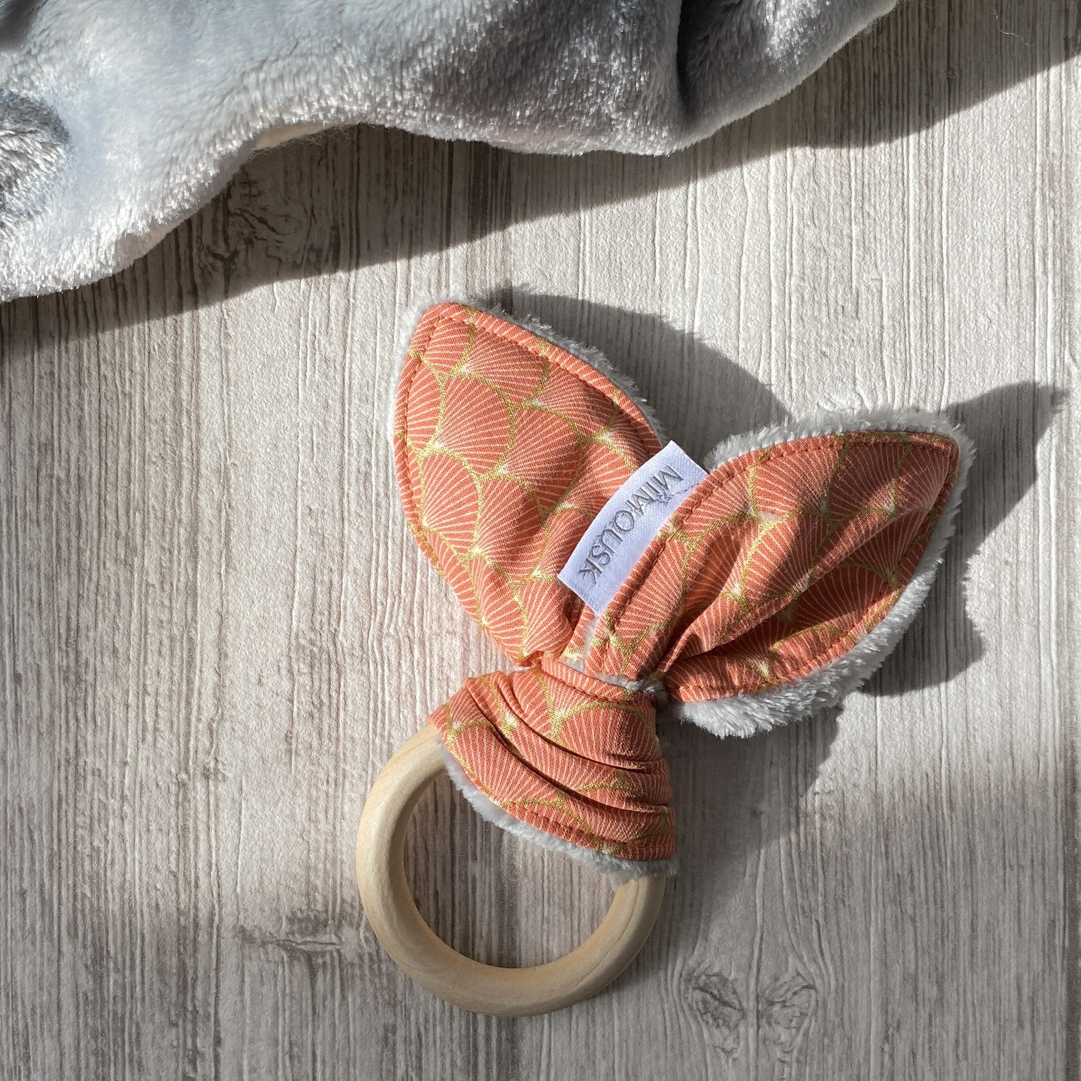 Dimensions : 15cm – Oreilles environ 8×6 cm / Anneau de dentition en bois non traité rond 6cm.