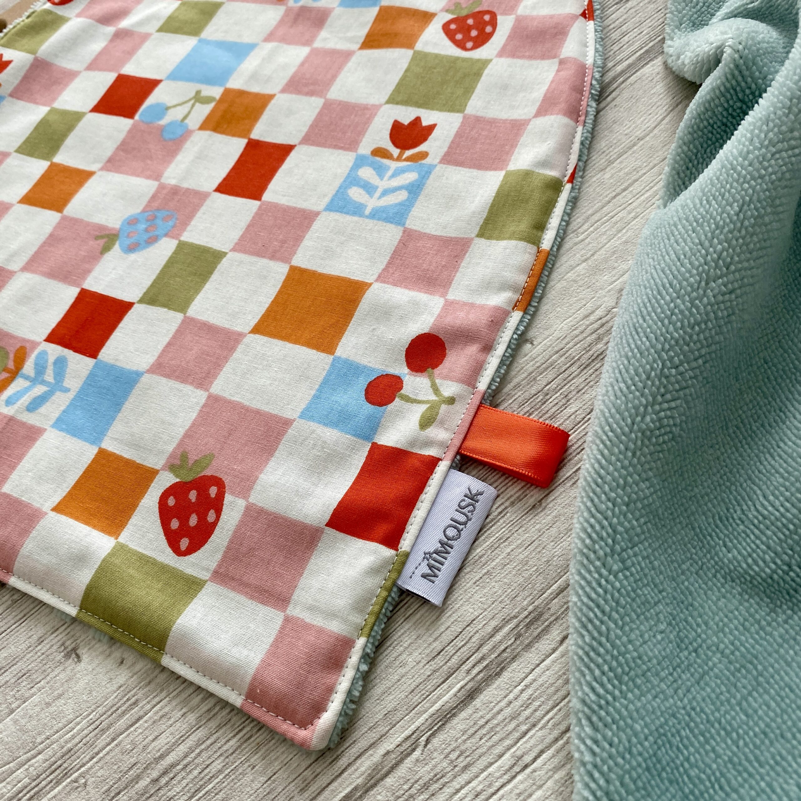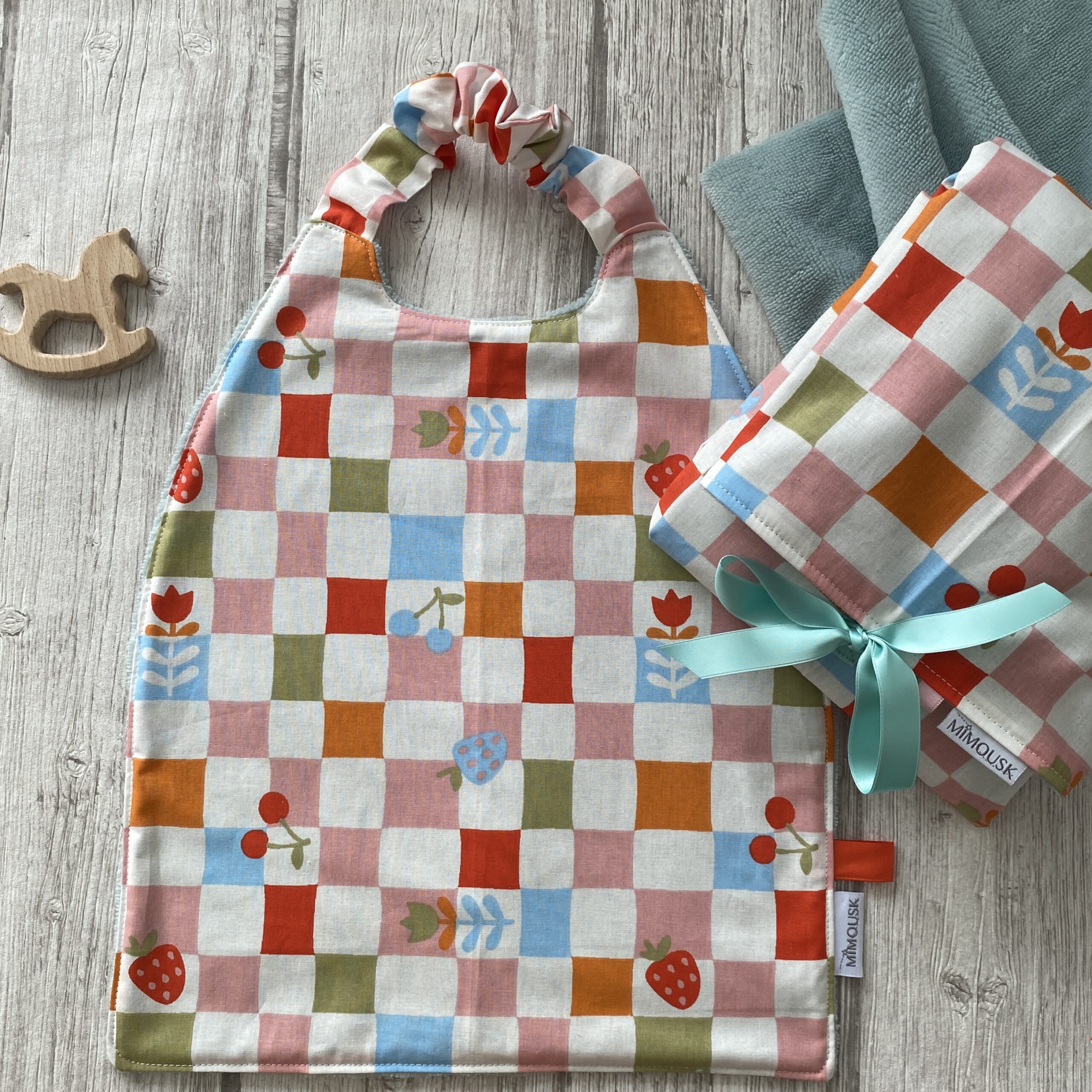 Grande serviette élastiquée, ou serviette de cantine pour la maternelle. Doublée en éponge bambou vert clair céladon, ultra douce et très absorbante. Devant en tissu imprimé damier et fruits. Coloris orange, bleu ciel, vert mousse, rose, rouge, écru. Ce grand bavoir permet à l’enfant de développer son autonomie car il peut l’enfiler seul. Très pratique.