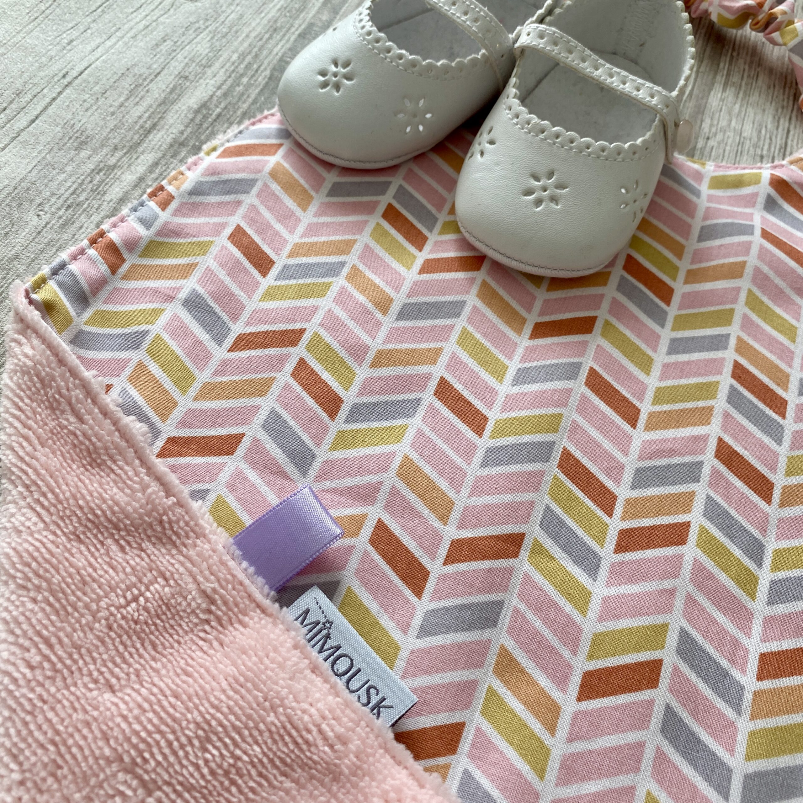 Grande serviette élastiquée, ou serviette de cantine pour la maternelle. Doublée en éponge bambou rose, ultra douce et très absorbante. Devant en tissu imprimé « chevrons » aux coloris pastel rose, parme, jaune pâle. Ce grand bavoir permet à l’enfant de développer son autonomie car il peut l’enfiler seul. Très pratique.