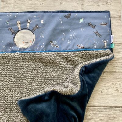 Couverture chaude pour bébé en laine et polaire ultra-douce. Tricotée à la main au point mousse, avec du fil contenant 20% de laine. Tricot coloris gris pailleté effet métallique. Dos en polaire ultra-douce coloris marine. Revers en tissu coton imprimé Art fabric USA « Love you to the moon and back » avec animaux dans l’espace, planètes et lune. Passepoil bleu pour une jolie finition.