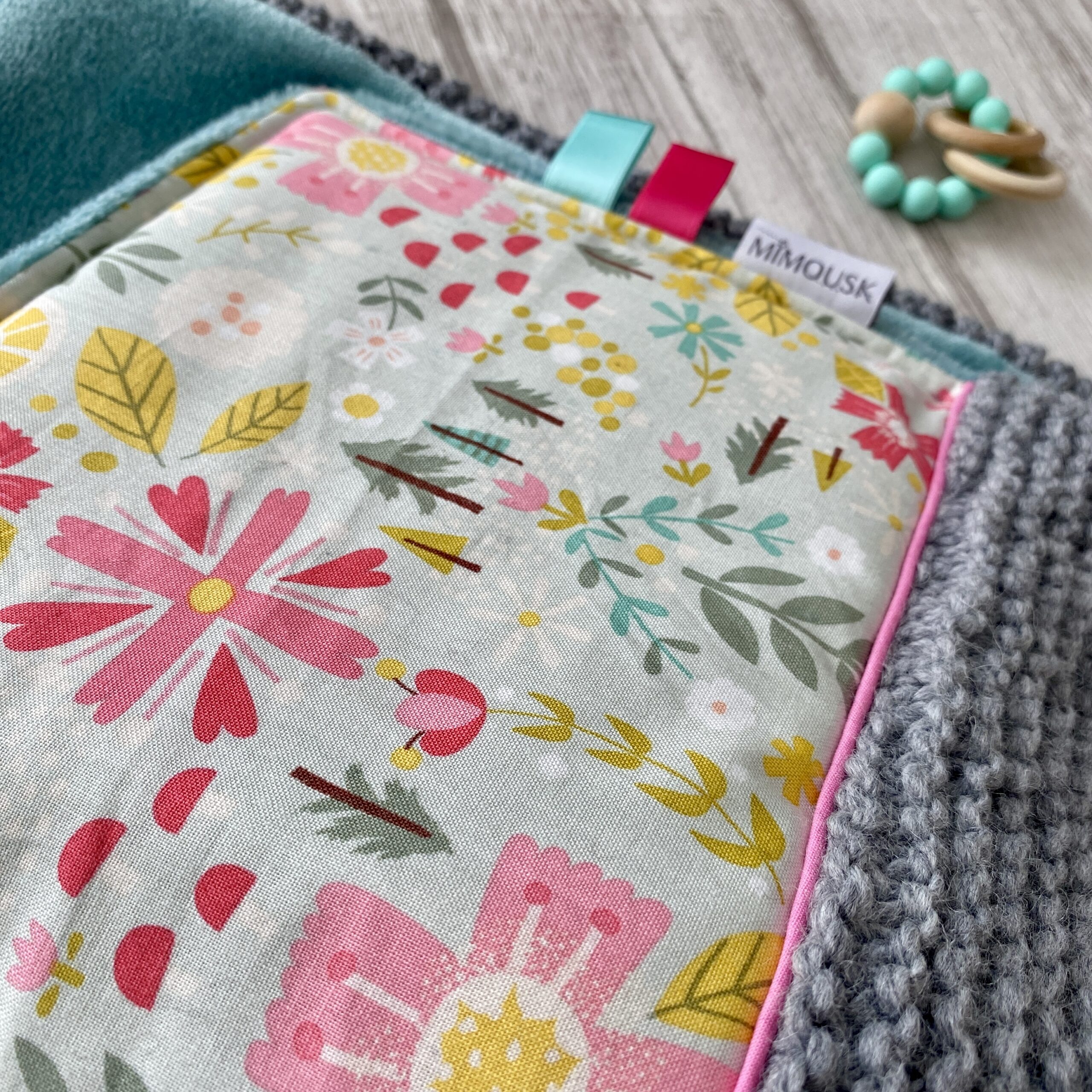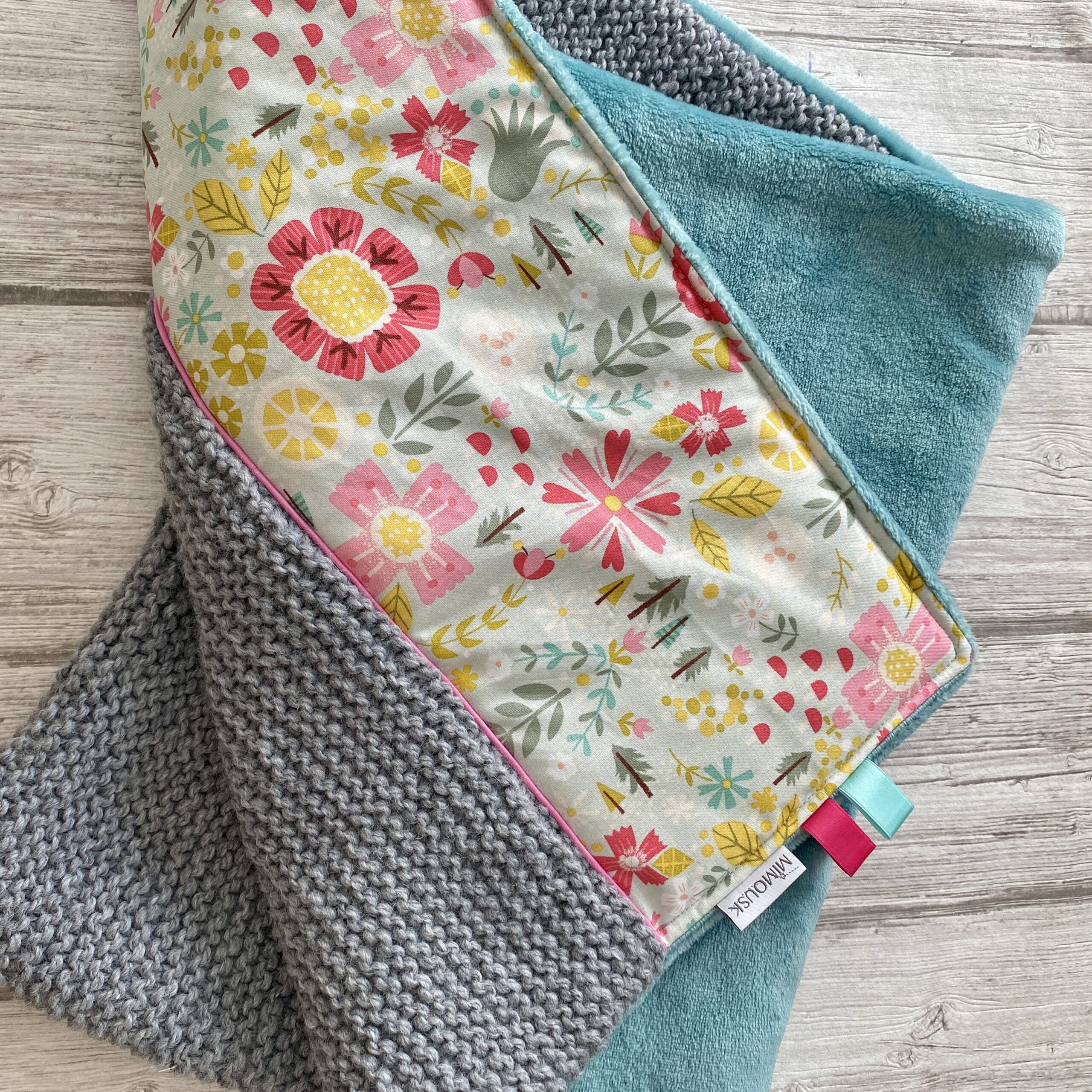 Couverture chaude pour se réchauffer les genoux sur le canapé, ou pour bébé. En laine et polaire ultra-douce. Tricotée à la main au point mousse, avec du fil contenant 20% de laine. Tricot coloris gris. Dos en polaire ultra-douce coloris vert. Revers en tissu imprimé fleuri, joyeux et végétal. Des fleurs stylisées dans les tons de jaune, rose, ciel, blanc, vert. Passepoil rose bonbon pour une jolie finition.