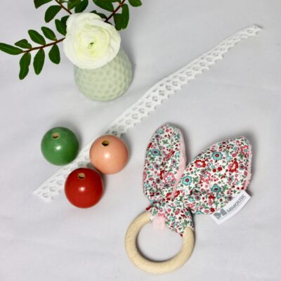 Dimensions du doudou noeud : environ 23×10 cm / Anneau bois baleine 5×6,5cm.