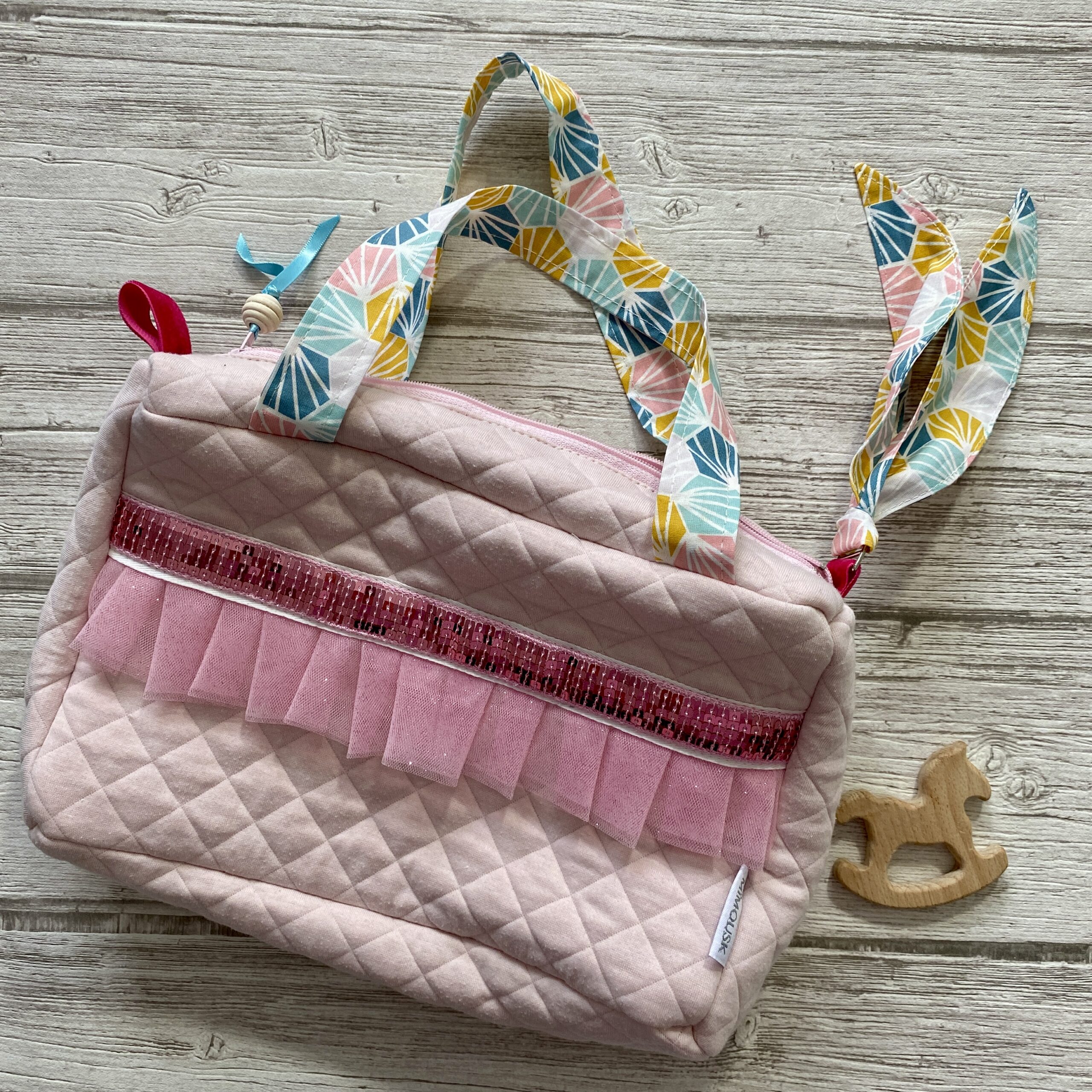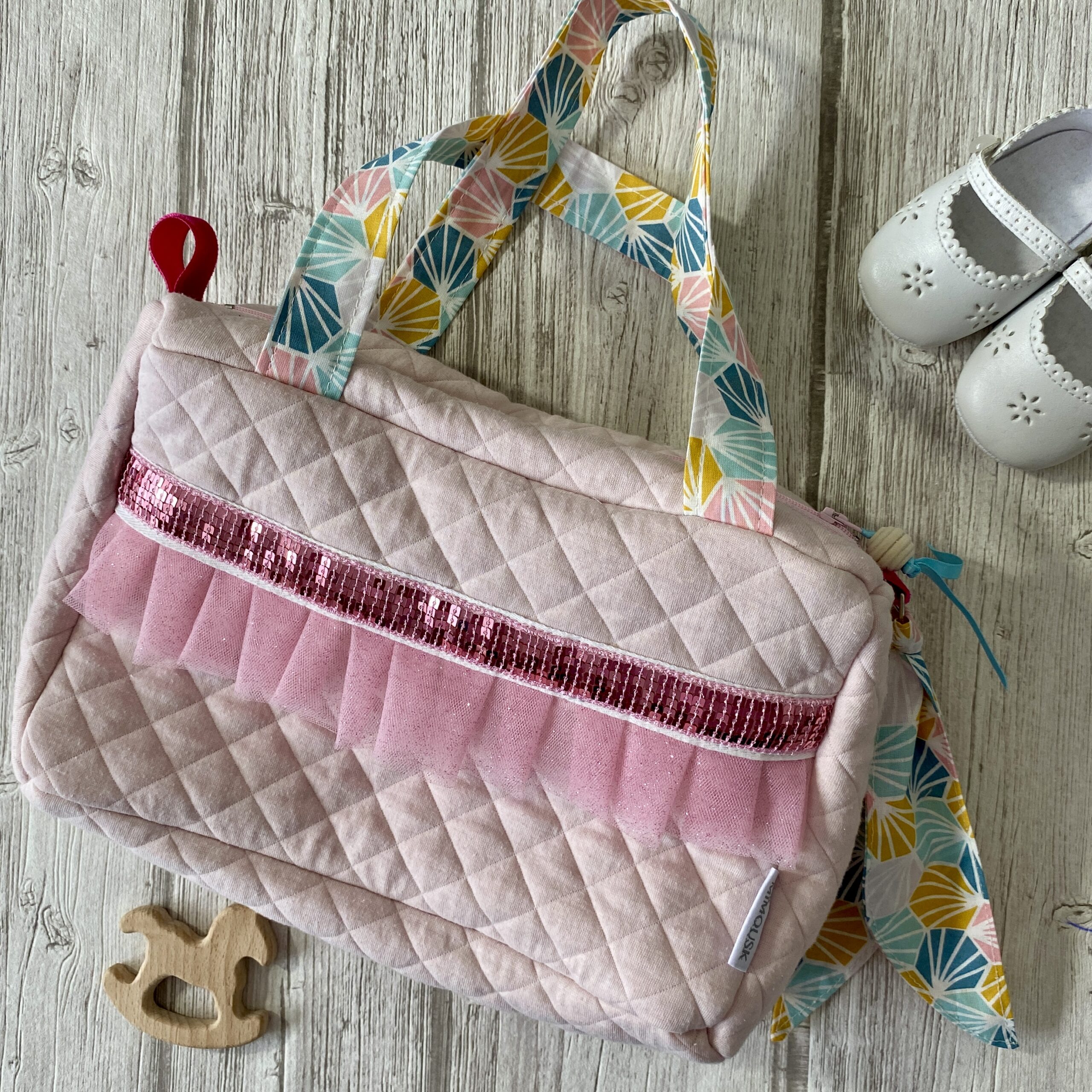 Craquez sur cet adorable sac de danse tellement girly ! En molleton matelassé rose poudré, agrémenté d’une bande de tulle rose pailleté, esprit « tutu », et de sequins rose brillants. Grande ouverture grâce au zip rose de 28cm, et volume idéal pour transporter toutes les affaires de danse sur l’épaule, ou le pyjama pour aller dormir chez une copine. Anses en coton coloris rose, ciel, jaune, motif origami. Gros noeud assorti sur le côté. Petits rubans en velours rose aux bouts du zip.