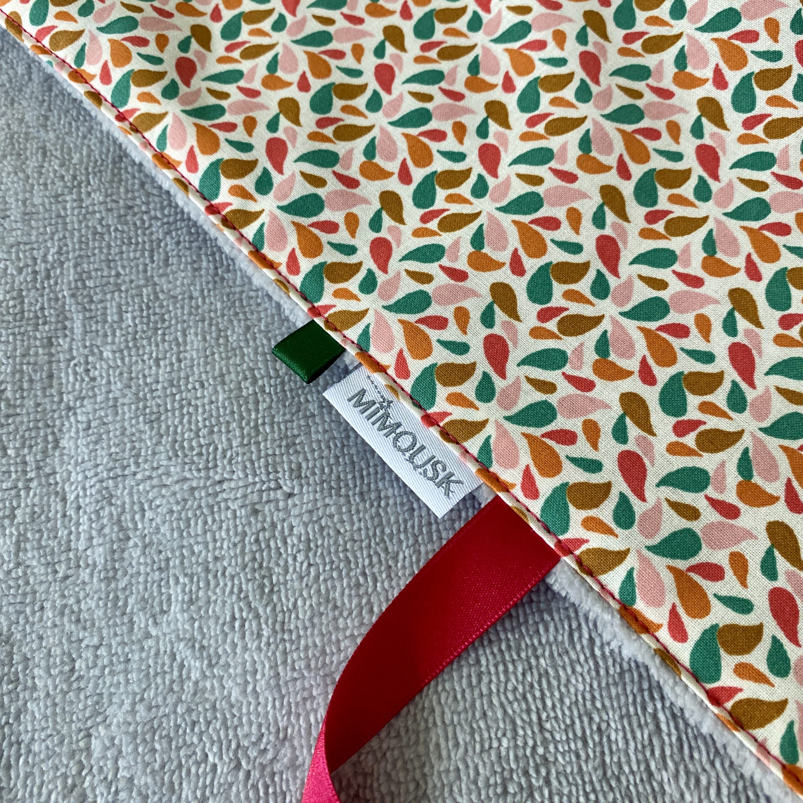 Tapis à langer nomade, très pratique pour changer bébé en balade n’importe où. Réalisé dans un tissu oeko-tex « otma » motif gouttes dans les tons de rose vif, vert, ocre, orange, sur fond blanc cassé. L’intérieur de ce matelas à langer nomade est en éponge bambou grise, ultra absorbante et moelleuse. Une fois le tapis de lange déplié, profitez du petit oreiller confortable attaché en haut (plié pour les nourrissons, et déplié vers l’extérieur quand l’enfant grandit). La fermeture se fait avec des rubans à nouer. Un cadeau très utile qui plaît à coup sûr à tous les jeunes parents !