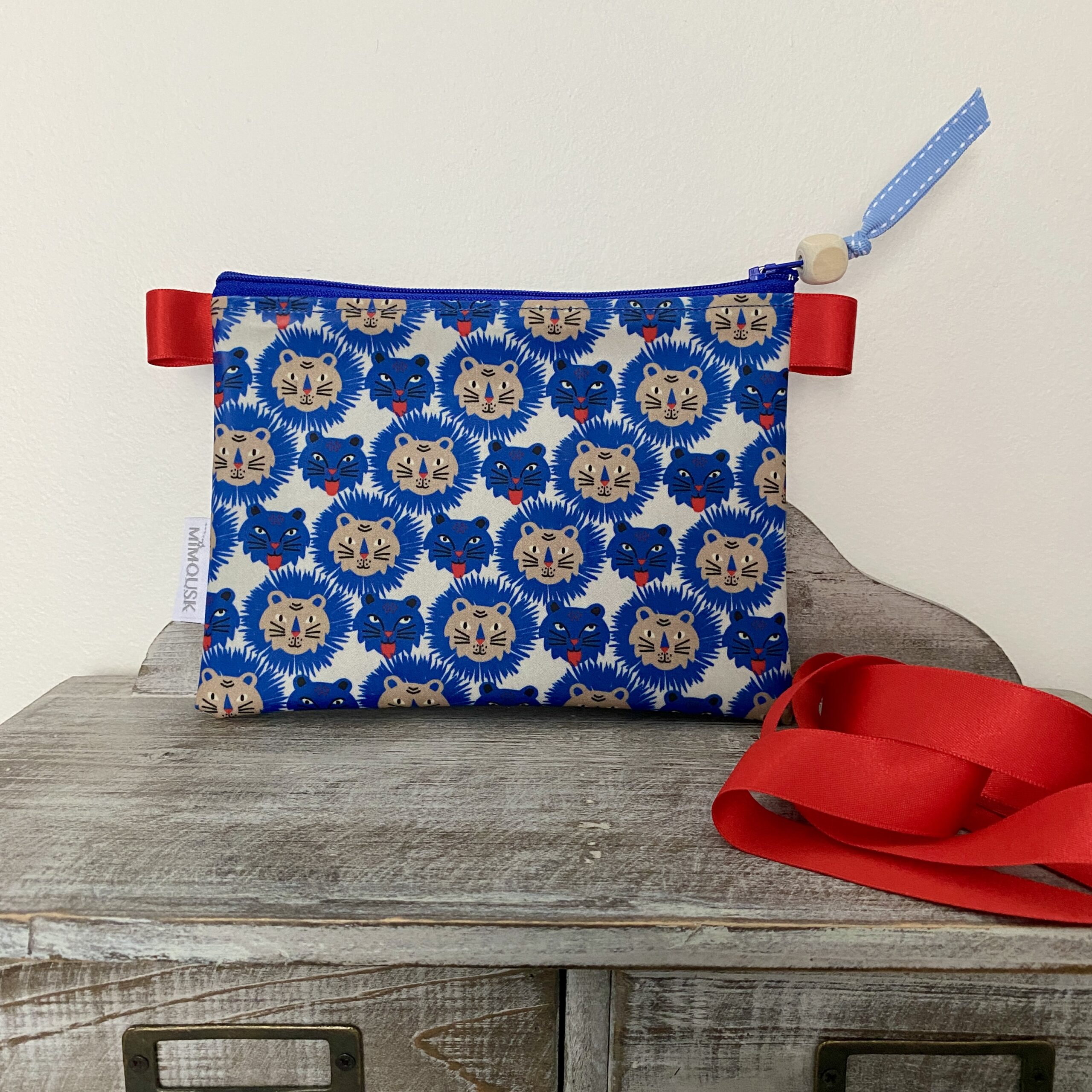Trousse plate enduite non doublée. De quoi ranger toutes les petites affaires de toilette de votre enfant. Utilisable aussi comme trousse à stylos et feutres ! Tissu enduit lavable d’un coup d’éponge humide. Ruban et perle de bois sur la tirette pour une jolie finition. Motif Lions, coloris rouge et bleu roi.