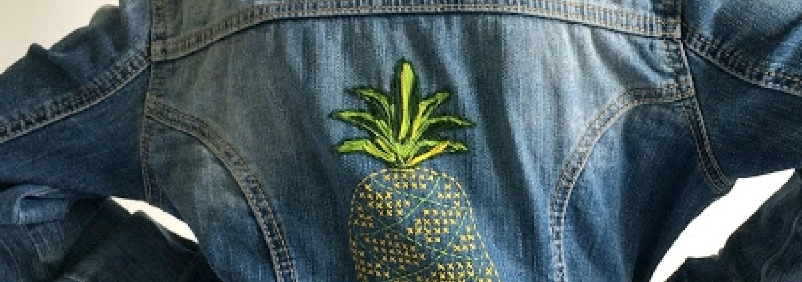 Il suffit donc d’apposer le film avec le dessin sur le dos de la veste. Puis de broder au point de croix au-dessus des emplacements. Ensuite quelques points droits pour marquer les contours. J’aurais pu m’arrêter là, mais il me paraissait un peu plat cet ananas. Du coup, afin de donner un peu plus de corps aux feuilles, j’ai réalisé un petit tissage au milieu pour la texture.